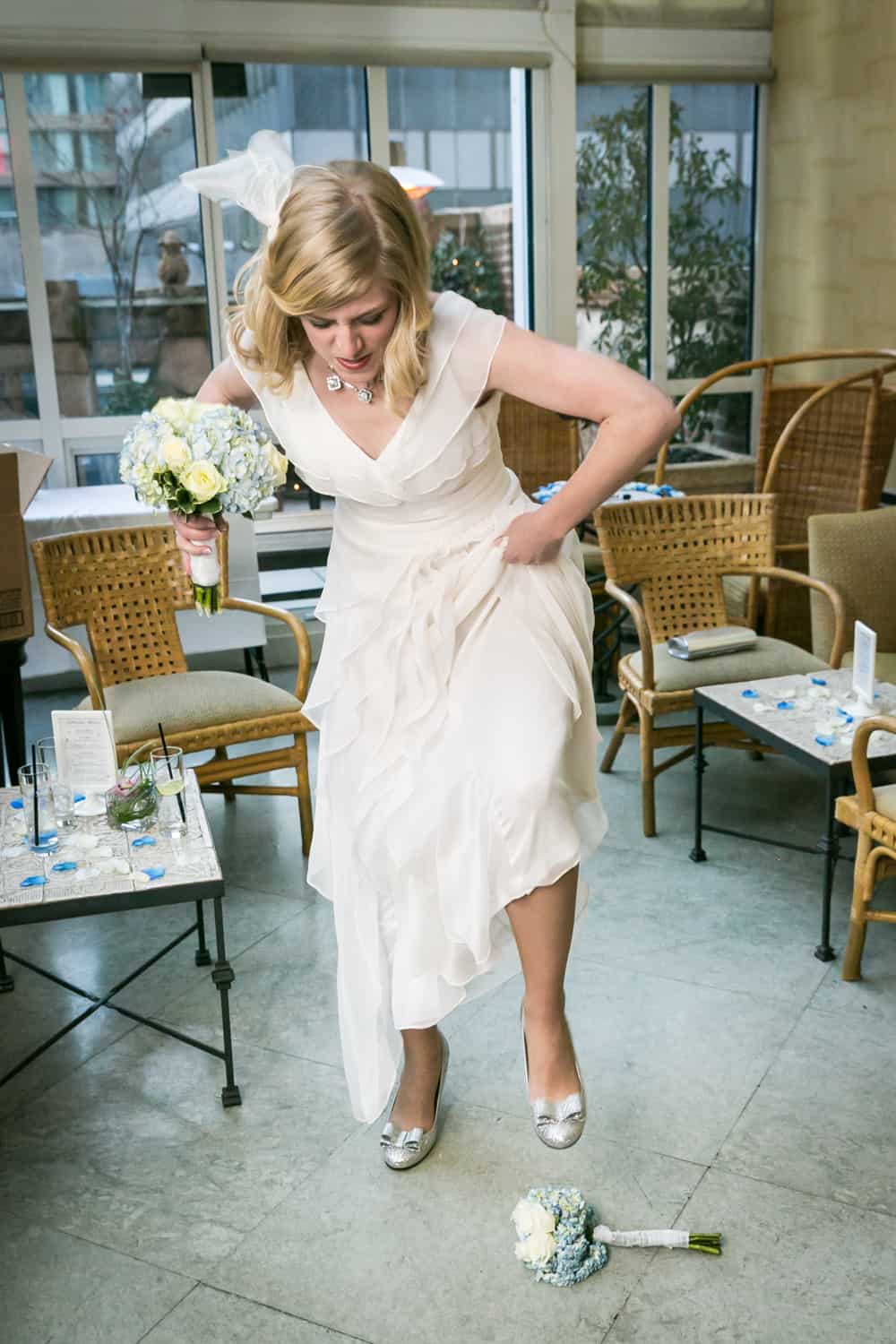 I need to offer a quick explanation for some of the funny photos from the wedding: unfortunately, the bride’s bouquet arrived a tad wilted. Tamara was determined not to let her less than stellar bouquet get her down. She made a quick call to the maid of honor, who saved the day with a much more lively replacement bouquet. To celebrate the new bouquet, and banish any other bad mojo, Tamara had a great time stomping on the old bouquet for my camera.