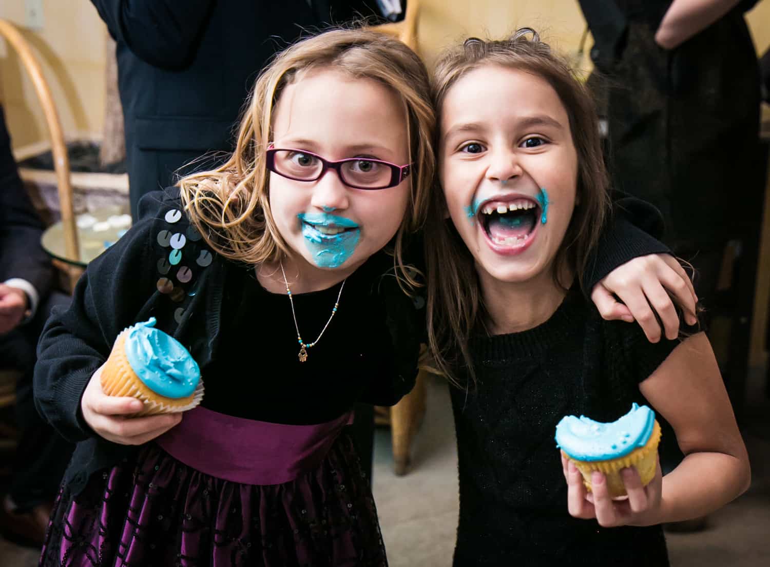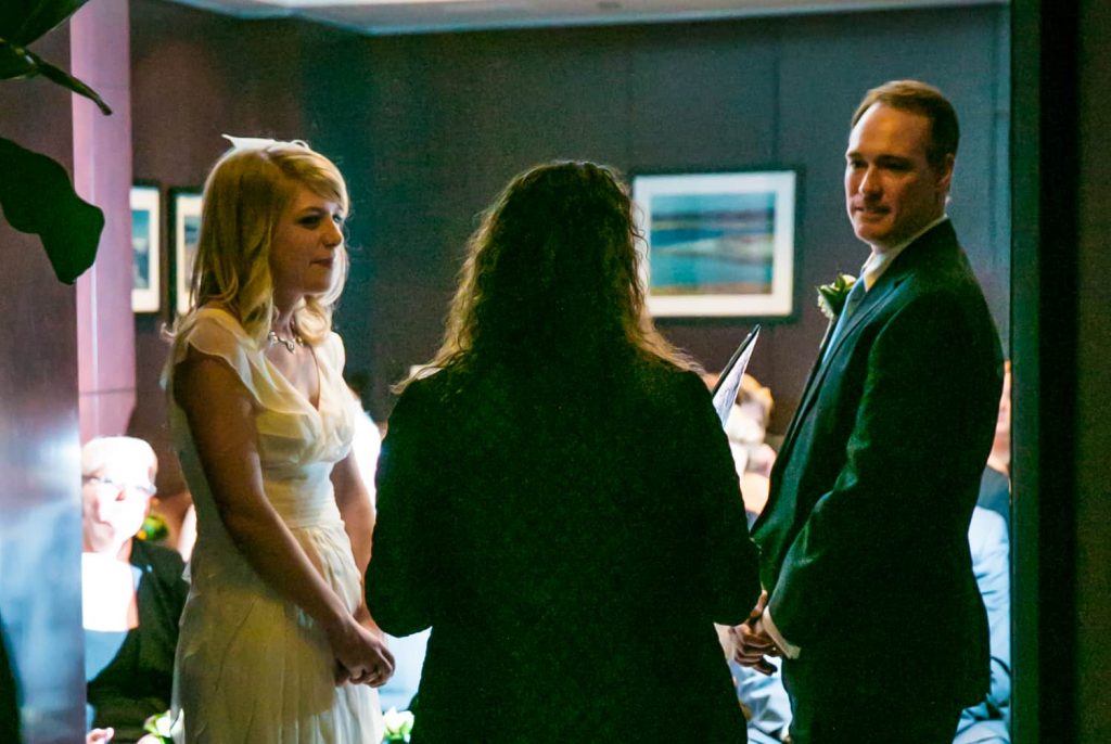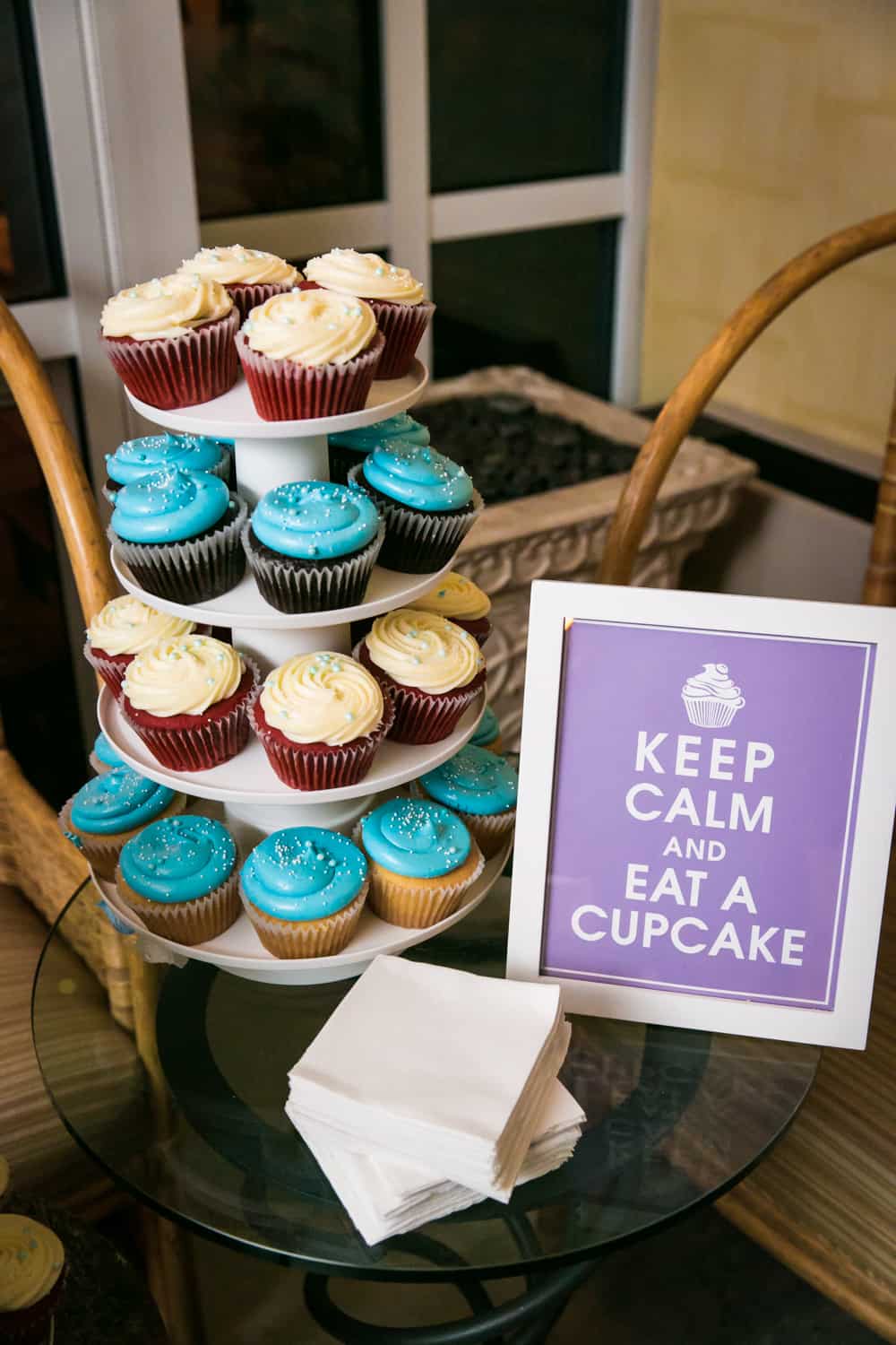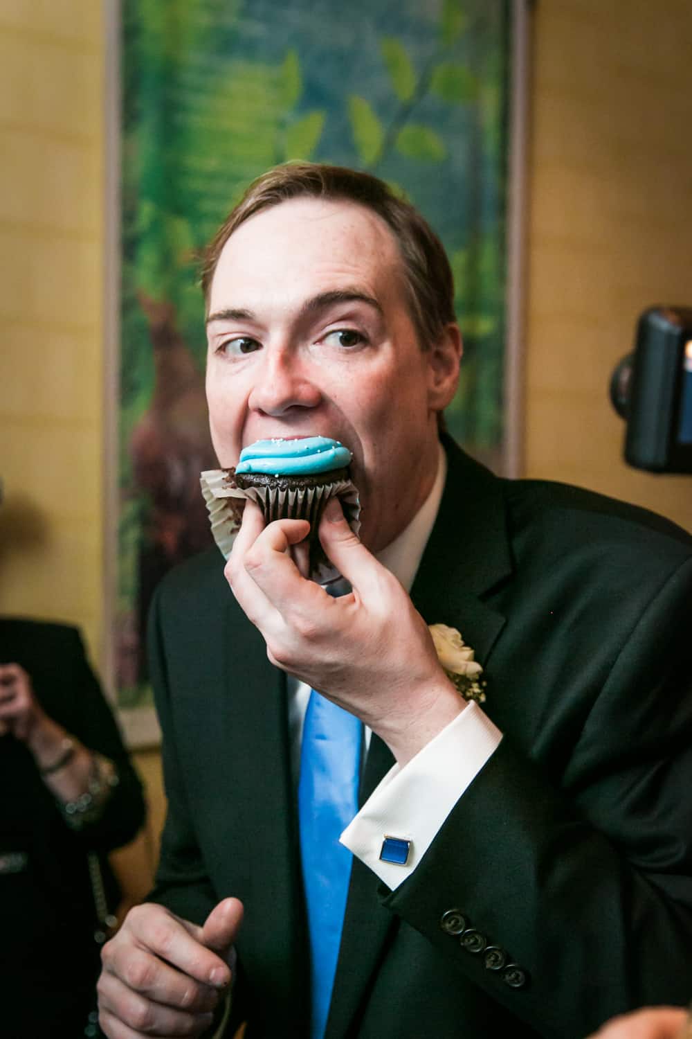 The sweet ceremony for the wedding was held in the main room, which was quickly transformed into cocktail and reception area. Space was limited, so readers during the ceremony simply stood and performed. Finally, who needs a traditional cake when you have gigantic cupcakes?
