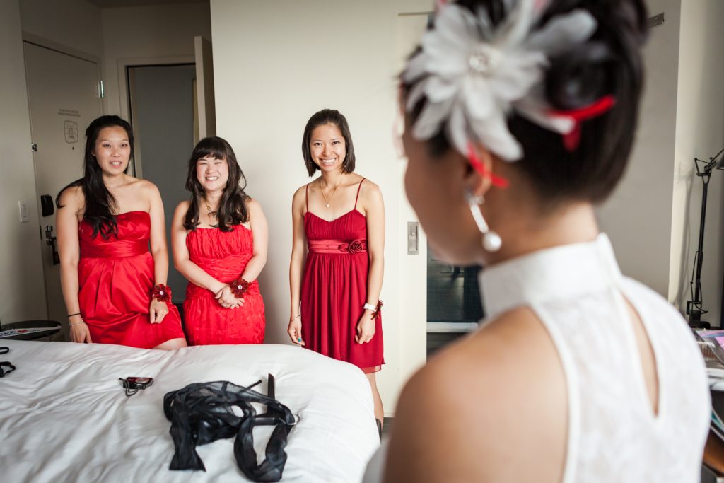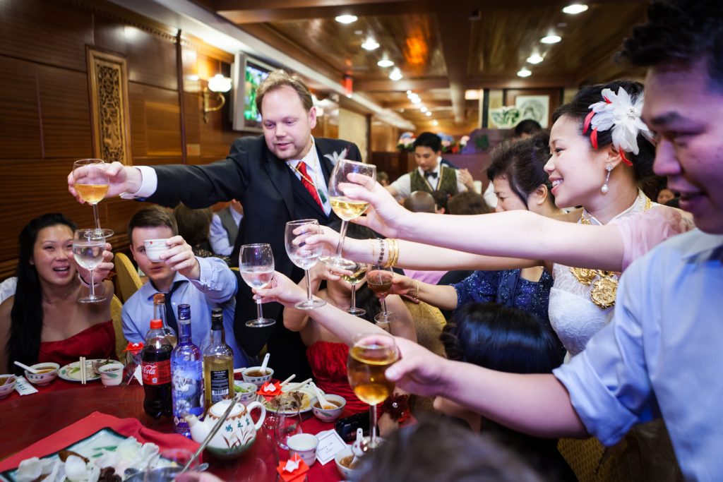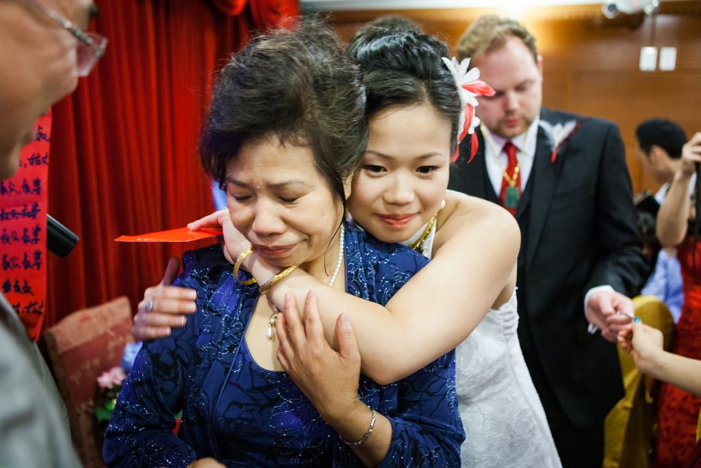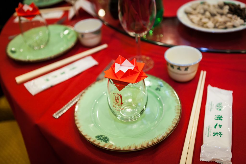 This photo was taken at Catherine and Wes’ reception, right after the conclusion of the tea ceremony. During the ceremony, the couple offers tea and their utmost respect and thanks to family and close friends by quite literally offering them cups of tea. The couple in turn are gifted with gold items. The ceremony is specific to the Fujian province of China, where Catherine’s family is based. You can read more about the ceremony here.
