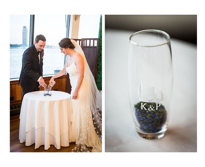 Speaking of large windows, the view during the ceremony was magnificent. The windows allowed for plenty of light. During the ceremony, the couple performed a glass-making rite. In case you are unfamiliar, the couple combine colored sand from two containers into one, which is then fashioned into a new art piece. I saw this ceremony performed at a Westbury Manor wedding, and it offers a unique take on the ‘two-become-one’ ceremony theme.