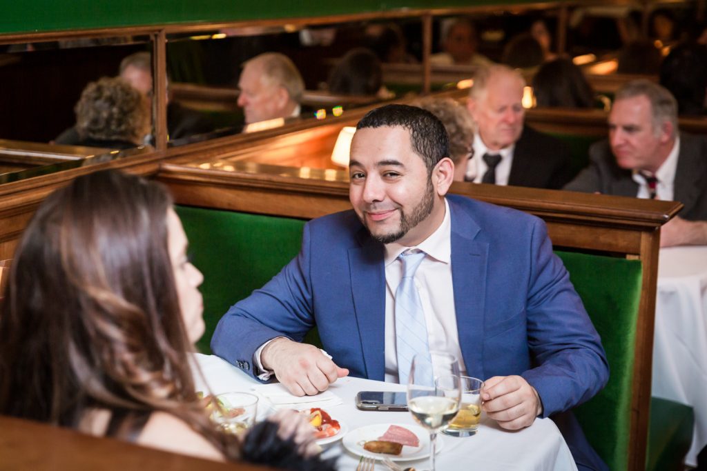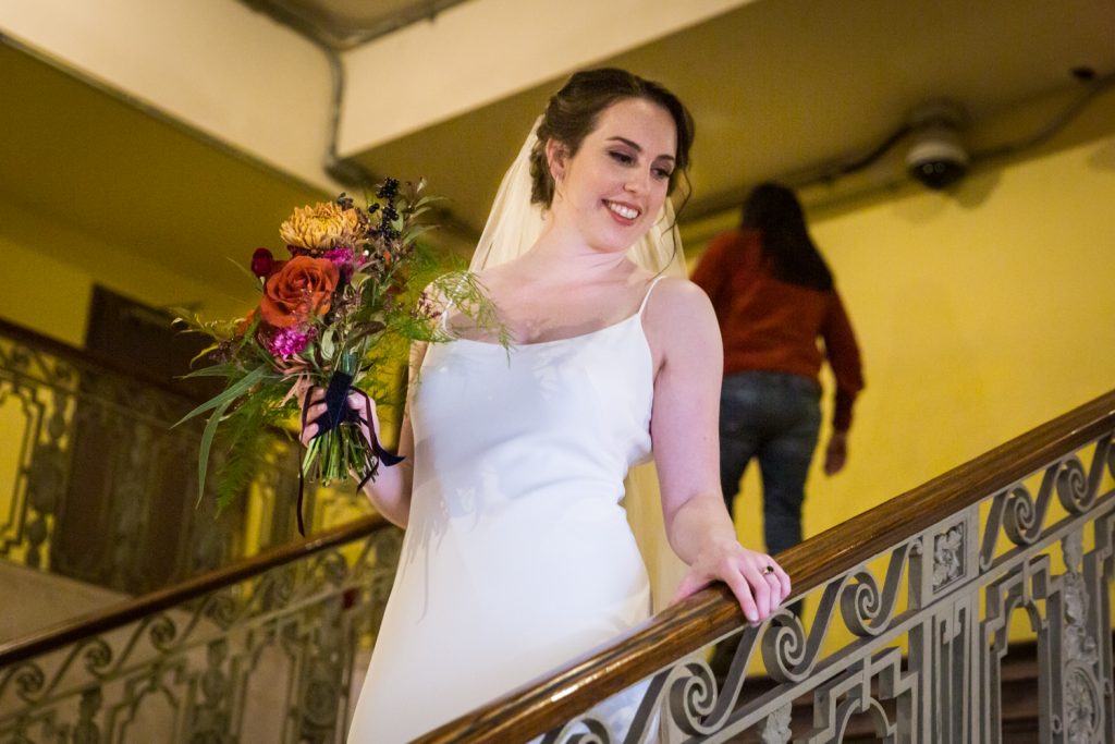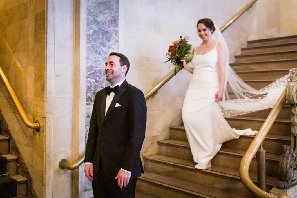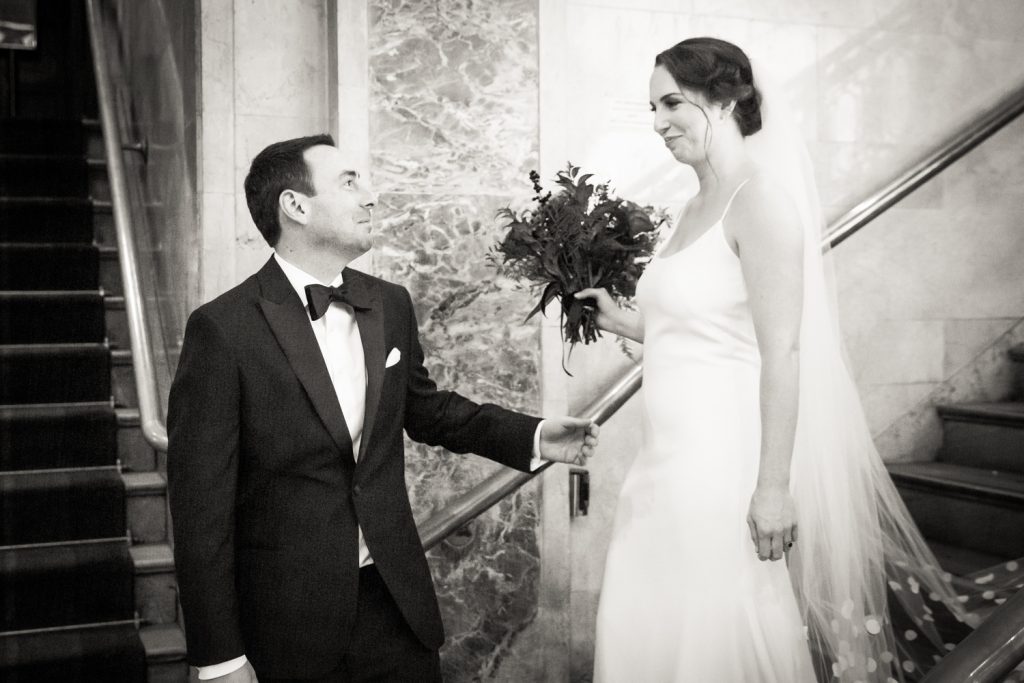 Kerry and Patrick are pretty private people. While they wanted their first look to be at Grand Central Terminal, they didn’t want to have a crowd of onlookers. As such, I had to hunt down a more secluded spot for their first look. My solution: the staircase next to the Campbell Apartment. This staircase leads to administrative offices (I think), but it is seldom used. These two had an epic private moment, and I recommend this spot if you are looking for an out of the way location within the iconic Grand Central Terminal.