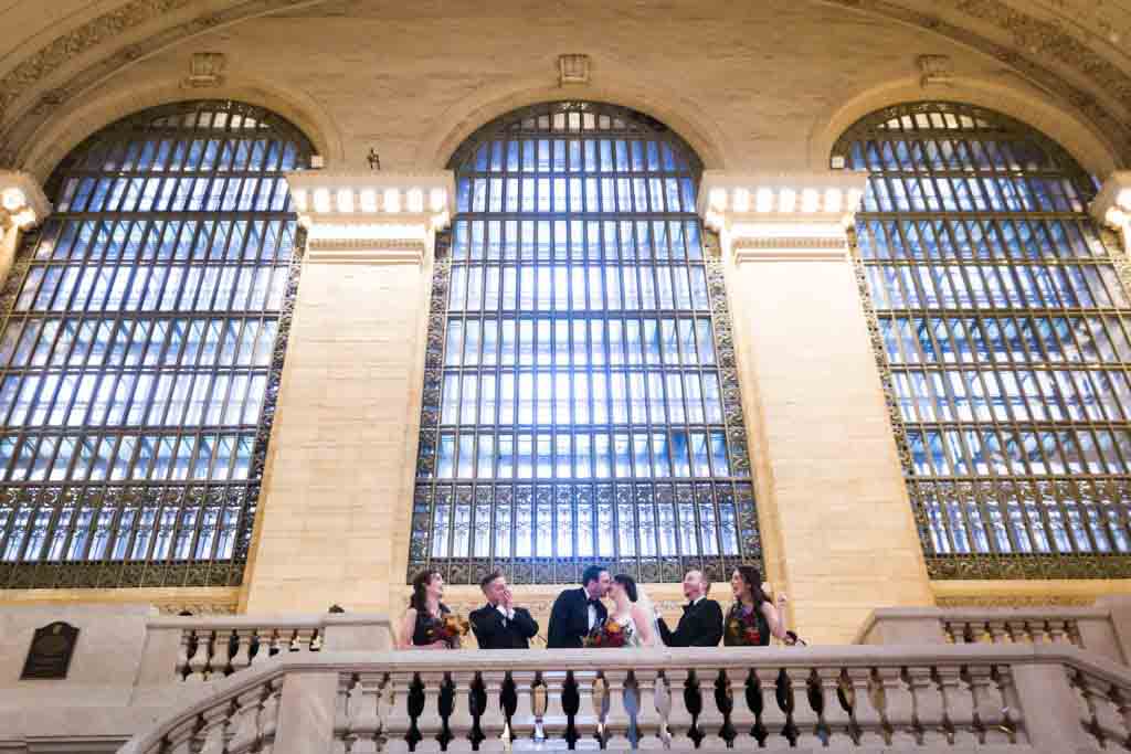 We then moved on to bridal party photos in the main concourse. Be prepared for crazy when you come to Grand Central Terminal. In addition to commuters who just want to get to their damn train, you also have tourists who will stop, stare, and get in the middle of your photo. Oh, and add in a heaping dose of interesting characters for some local color. Still, Grand Central Terminal remains a fantastic spot for photos in the city, and it is my all time favorite rain backup location. The spots we chose for photos include right in front of the clock tower, the gigantic windows behind the left staircase opposite the Apple store, and the hallway leading down into the dining concourse. Note that if you are going to be taking photos in Grand Central Terminal close to Christmas time, you will have to contend with the holiday market stall signs.