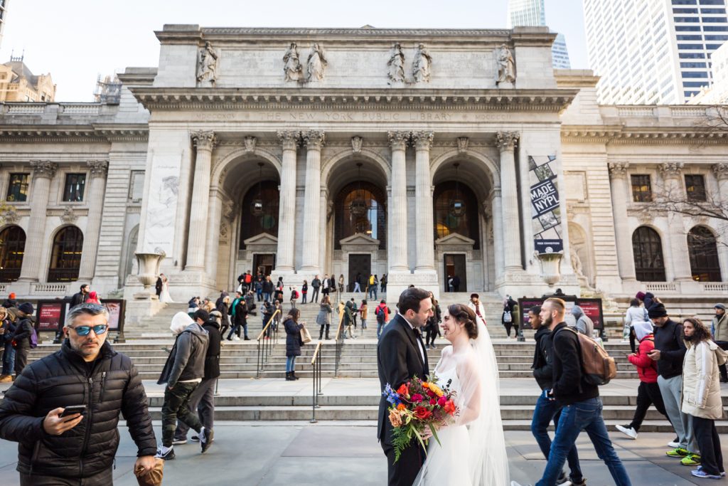 Our final stop before heading over to the Water Club venue was the New York Public Library. The Stephen A. Schwarzman Building on 42nd Street is near and dear to Kerry’s heart, as she used to work there during her college years. Despite the unceasing flow of bodies, we managed to get some great photos. Check out the surprise proposal happening behind Kerry on the steps of the building. Only in New York!