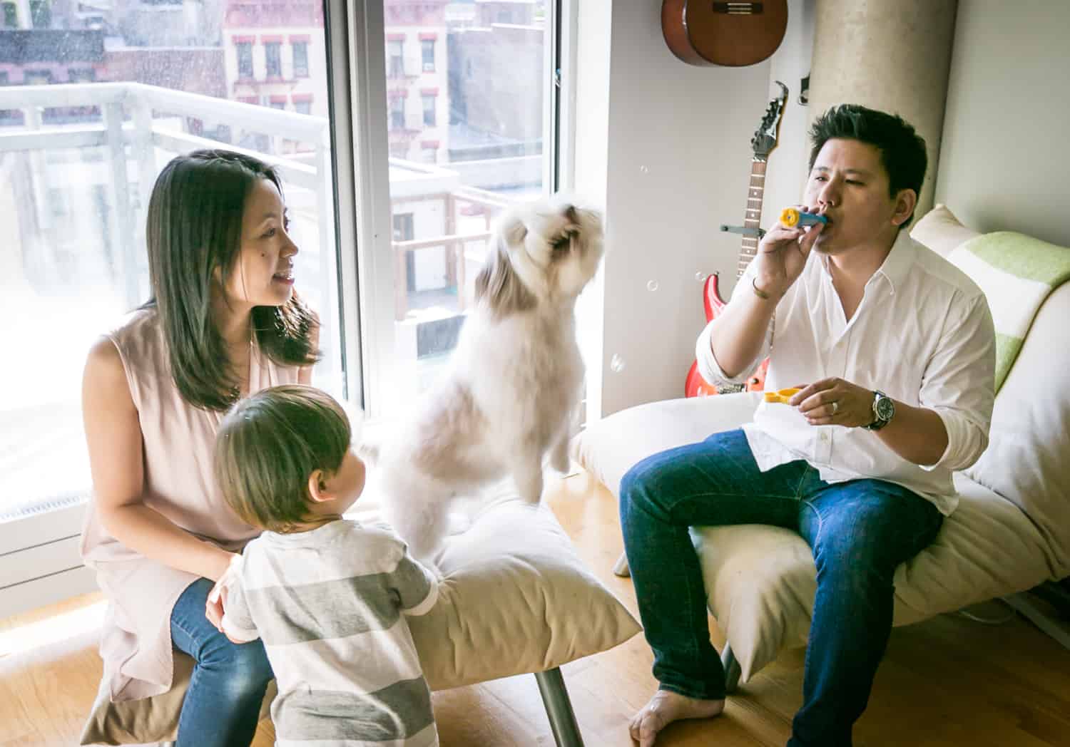 Luca is an adorable little boy who would be easy to photograph no matter what the situation. His mother, Sara, made my job even easier, however, with a series of activities planned for for our Manhattan family portrait session. We played with Manny, the dog; played with pillows on the bed, blew bubbles, and even had a family sing-along in the living room.