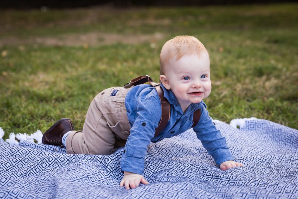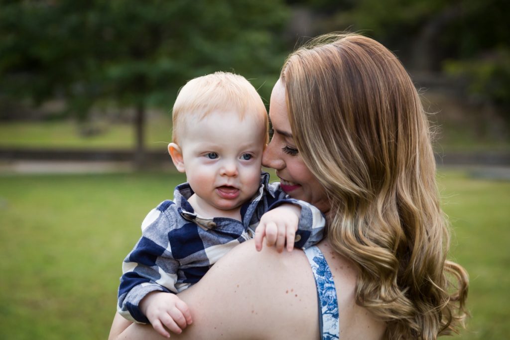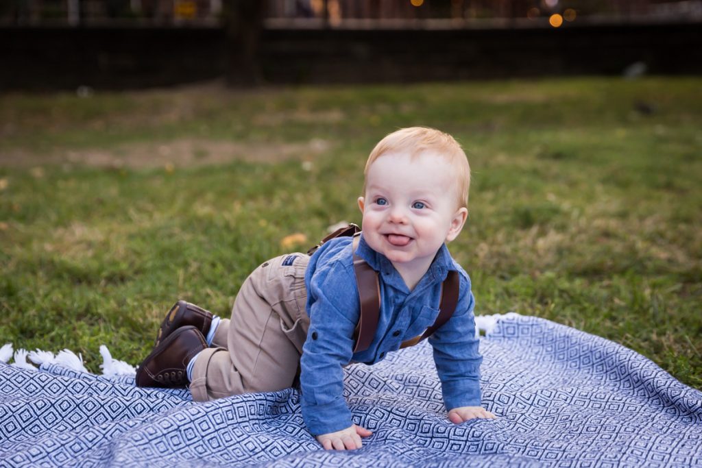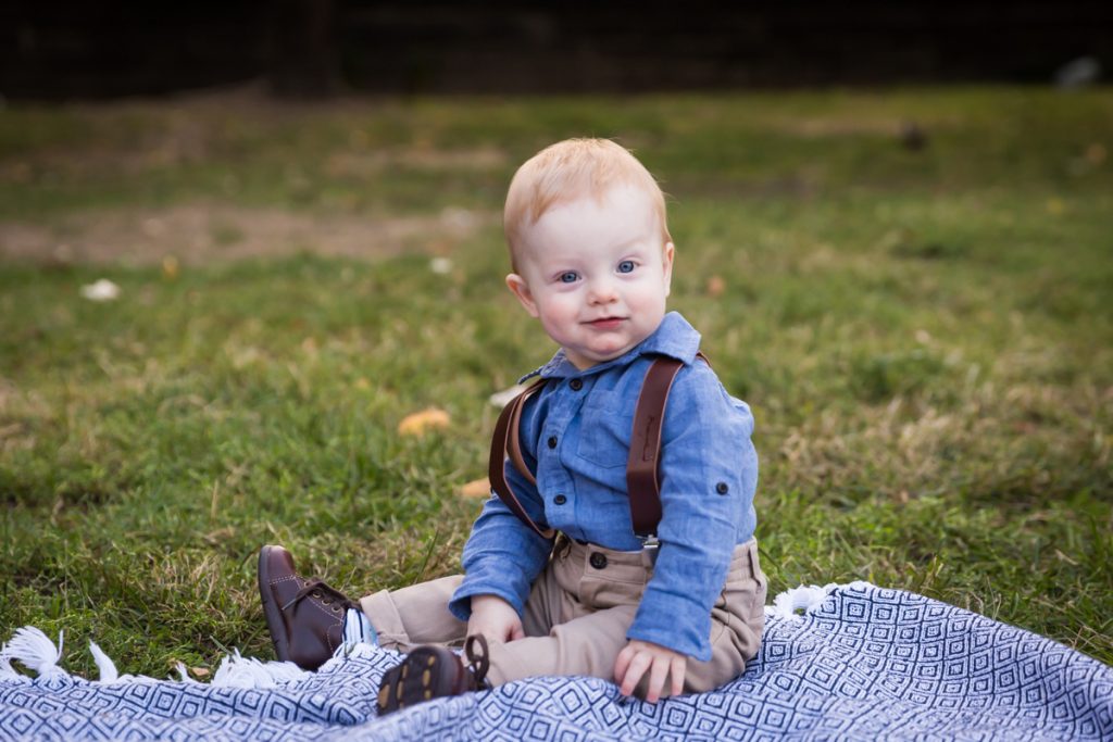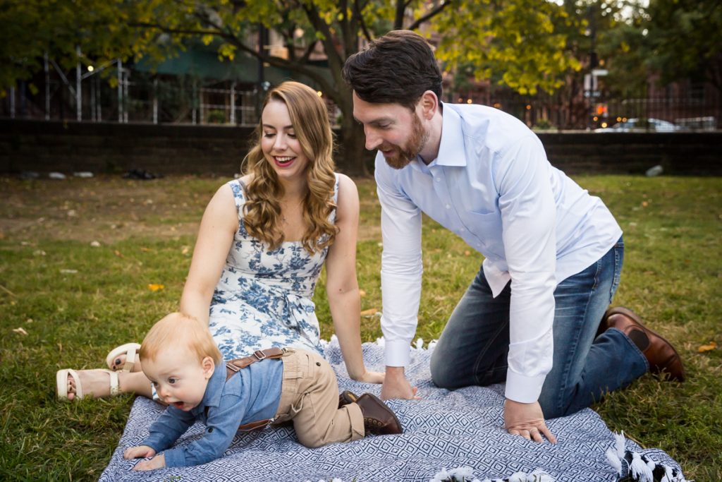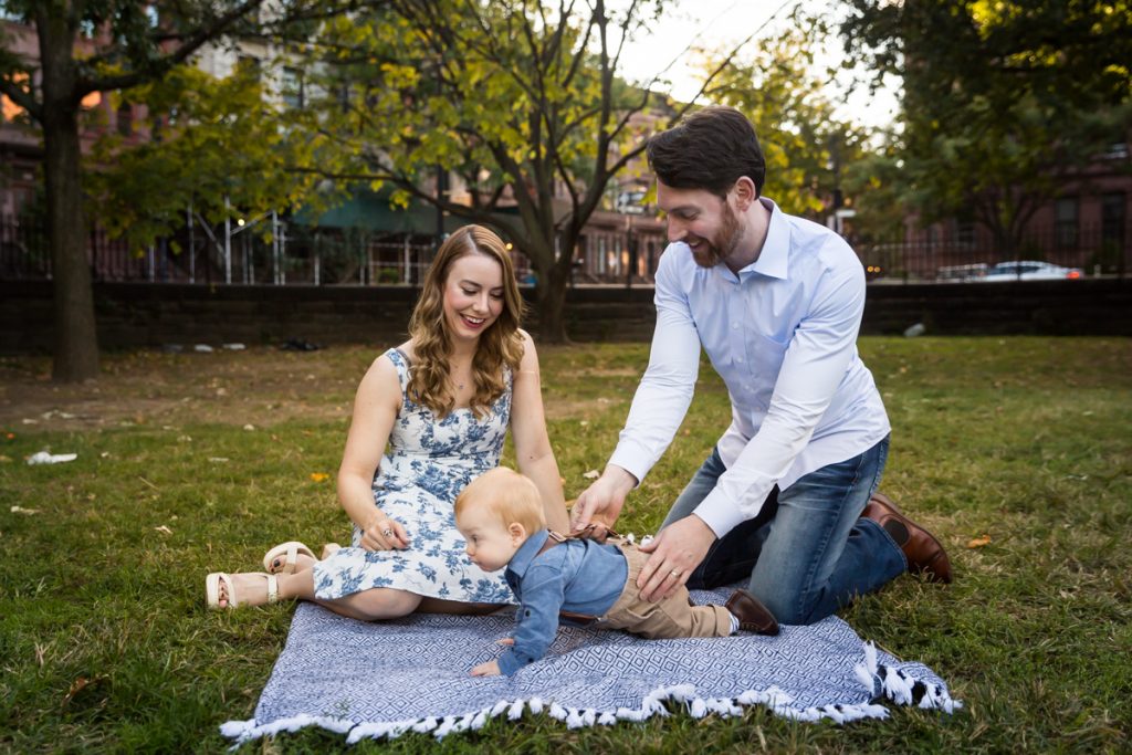Our next stop was to actually enter the park. If you head to the immediate left of the 120th Street and Fifth Avenue entrance, you find a nice patch of grass with benches. I used this area for individual photos of the baby with each parent, and we also put down a quilt for some photos in the grass. One word of caution: the park grounds on this particular day were littered with trash, so choose your grassy knoll carefully.