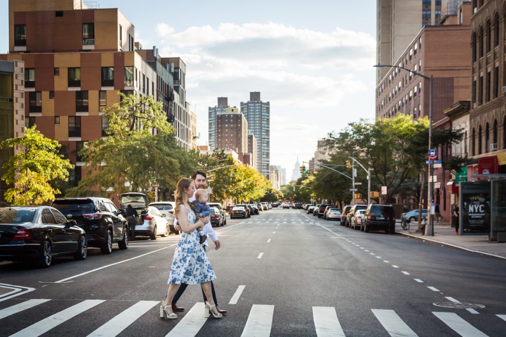 For Sara’s family portrait, we began her family session the corner of 120th Street and Fifth Avenue for a few city crosswalk shots. You can get an epic view of the downtown NYC skyline at this intersection, and if you time it right with oncoming traffic, you can get a great wide-angle shot.