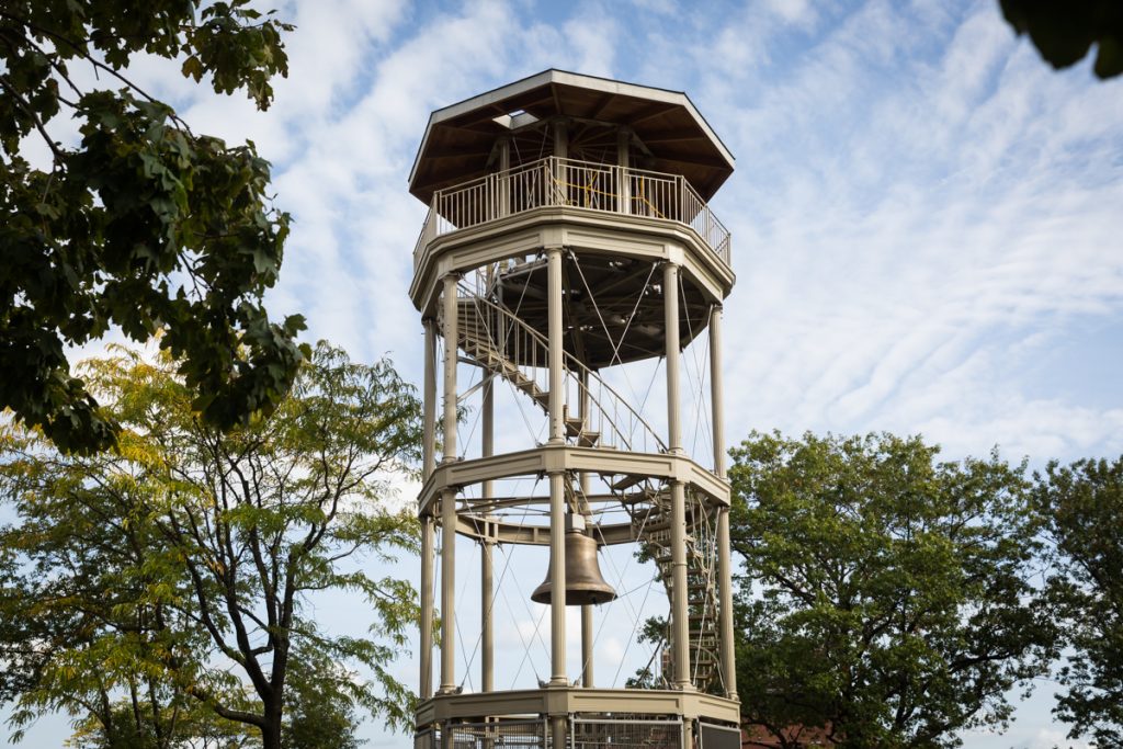 The most striking feature in Marcus Garvey Park is the fire watchtower in the center of the park. Erected between 1855 and 1857, the cast iron watchtower has a 10,000-pound cast bell at the top. The tower was designated as a city landmark in 1967 and is also on the National Register of Historic Places.