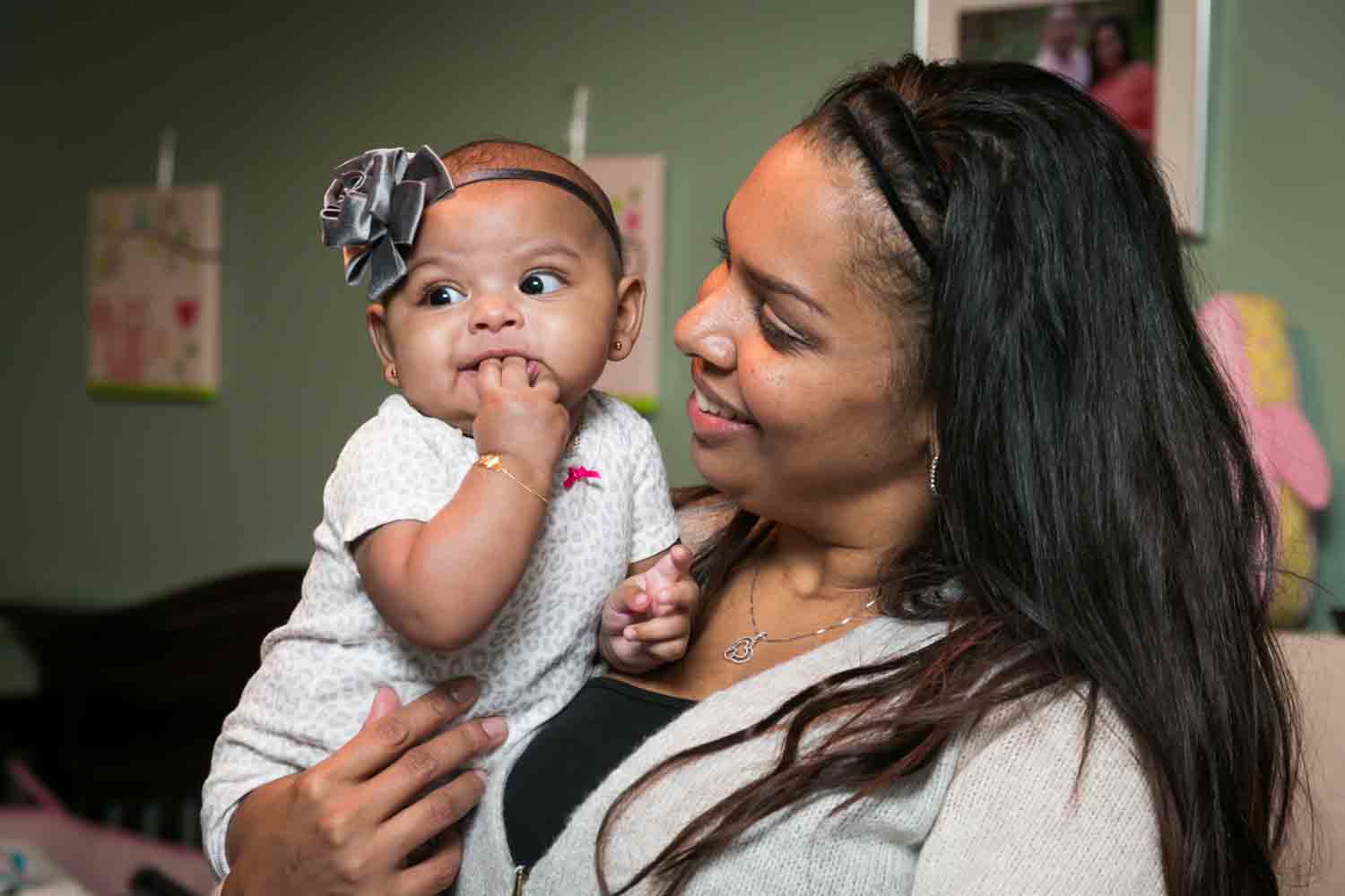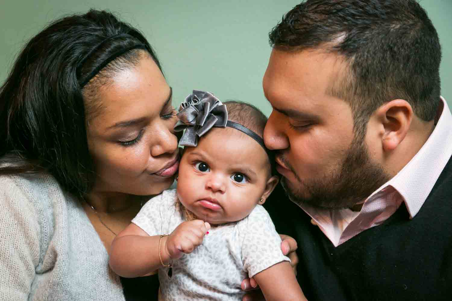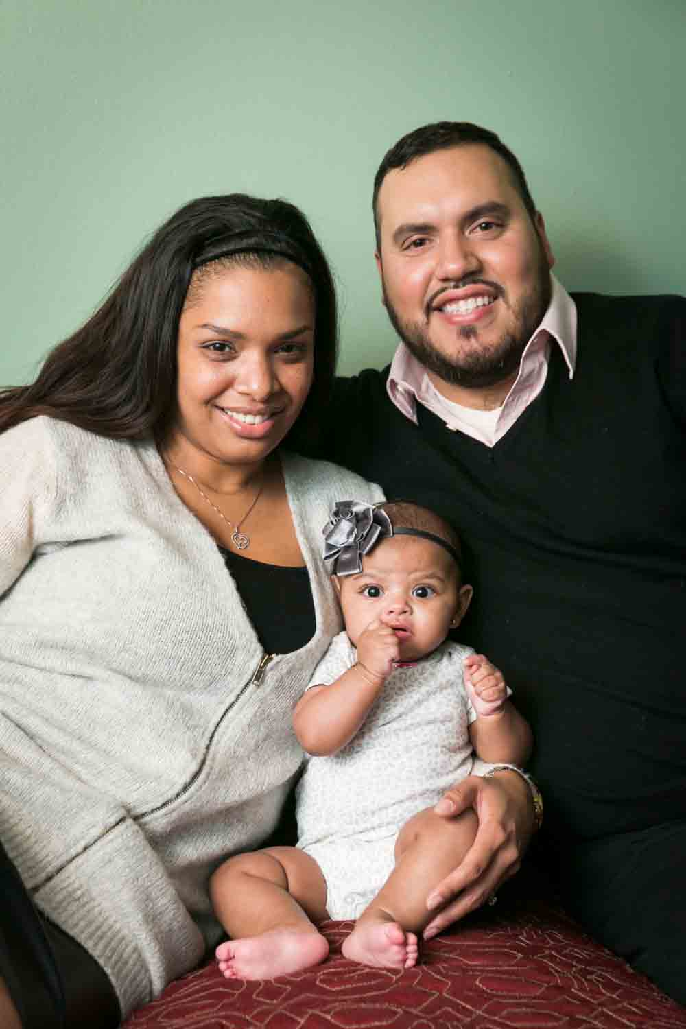 The weather, however, was a bit uncooperative, and Mikaela wisely made the choice for us to continue the photo shoot in Nancy and Ralfi’s apartment. As learned from this shoot, always have a backup location in mind and bring along lots of snacks and entertainment for the little ones. Nancy was totally prepared with a bottle and lots of toys. And one other item to note — this family portrait included the ENTIRE family: those with fur and without.