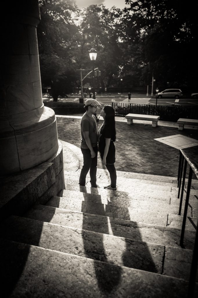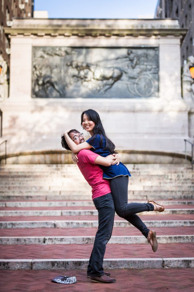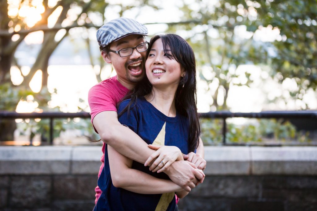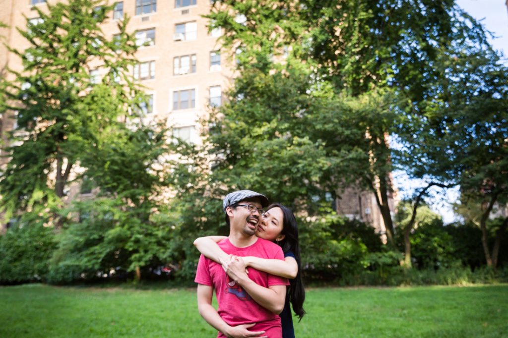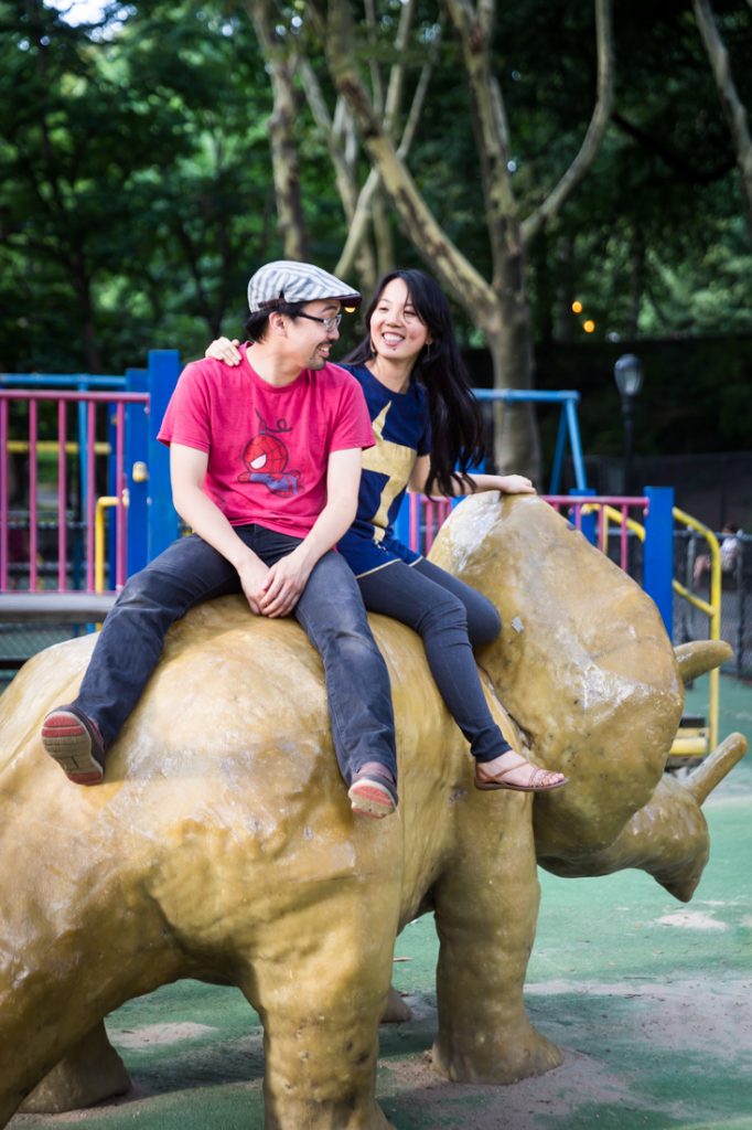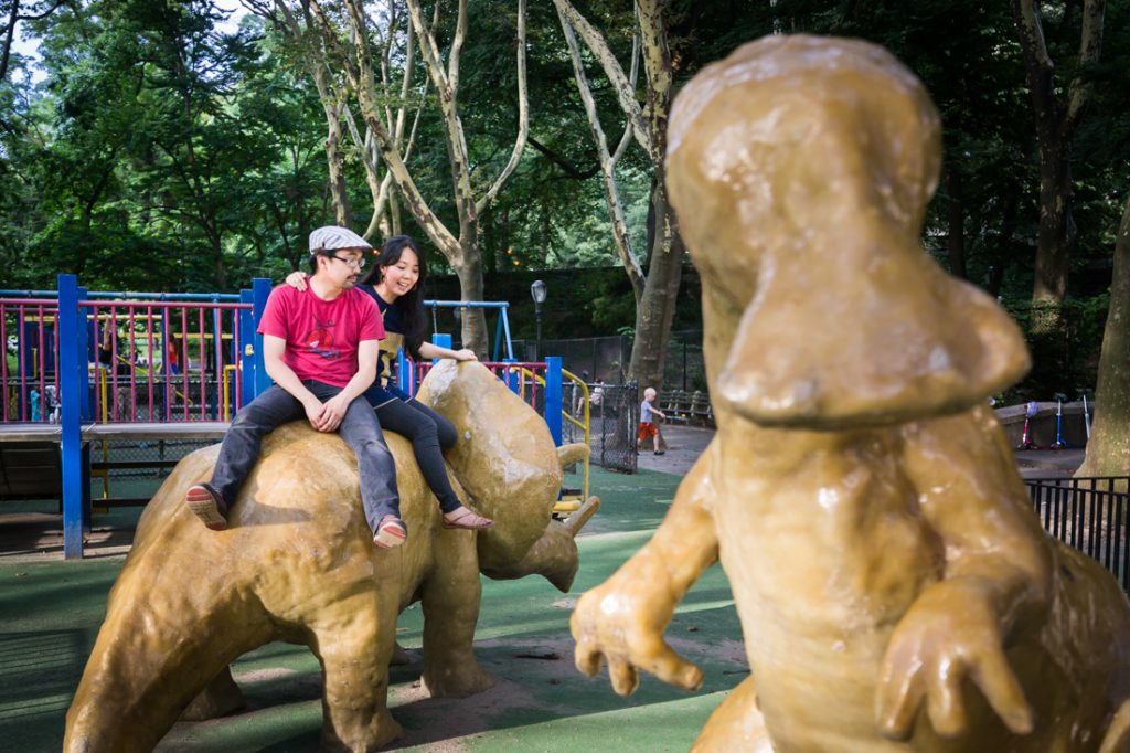 I would say Riverside Park is probably the second most popular park for an engagement portrait in the city. The park is scenic: it has waterfront views, a tree-lined promenade and forest-covered areas that make you feel like you have completely left the city. During the summer, there are flower gardens blooming around 79th Street that rival anything in the New York Botanical Garden. Again, if you walk up the park you can easily cross the street to Broadway and include a city feel to your engagement portrait session. If you have a playful nature like my clients Nancy and Jeff, you can also clown around on the park’s dinosaur sculptures in the playground at 96th Street.