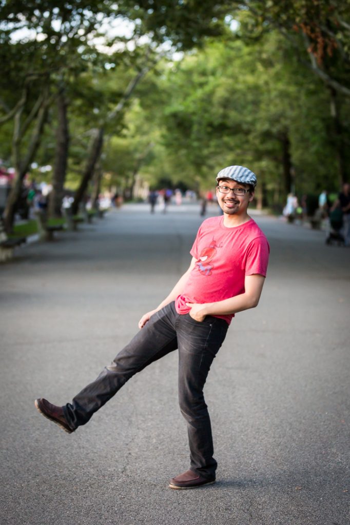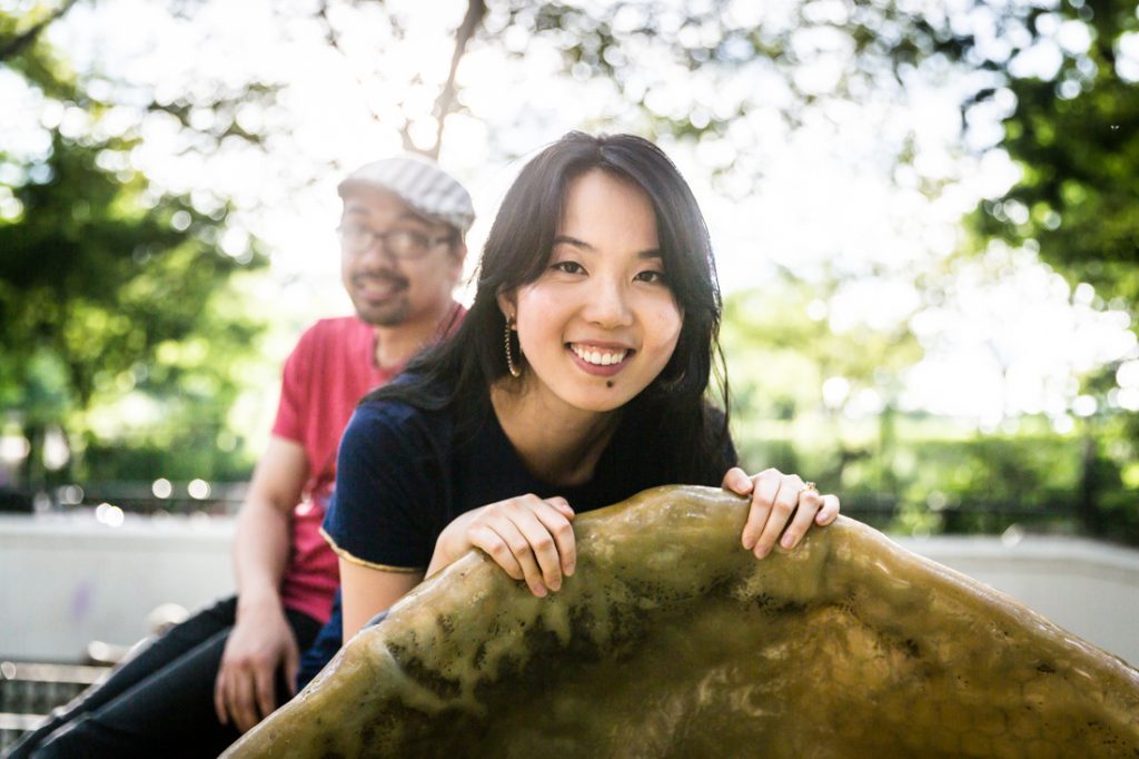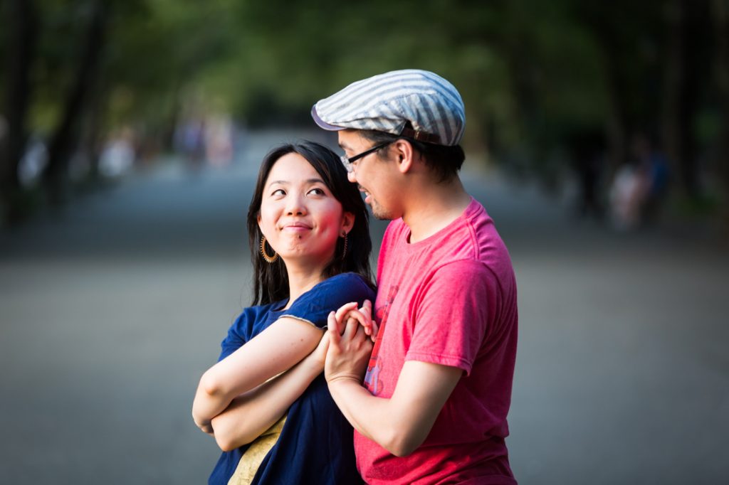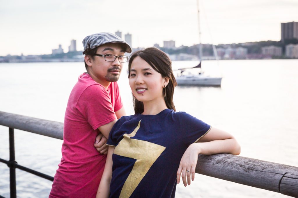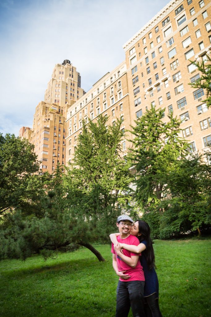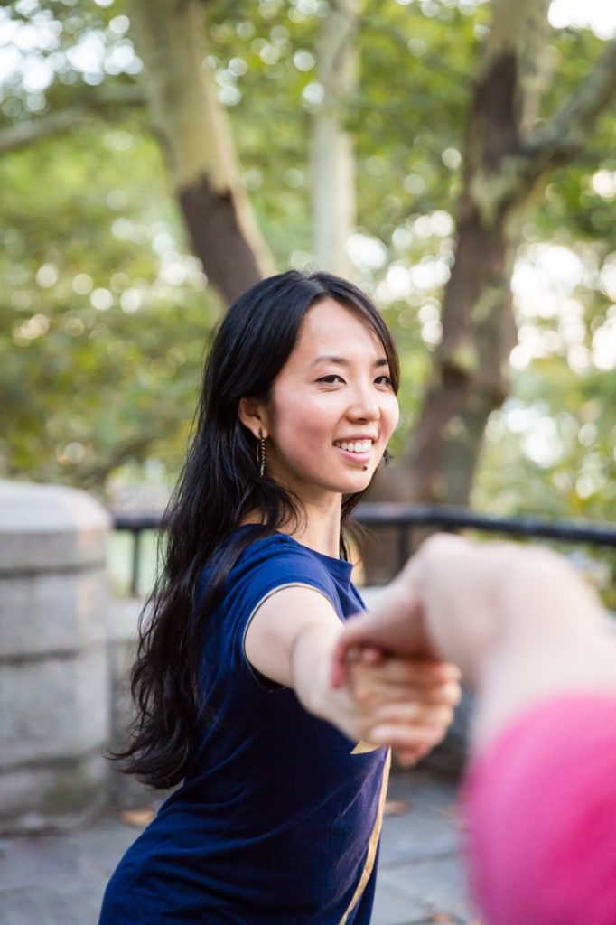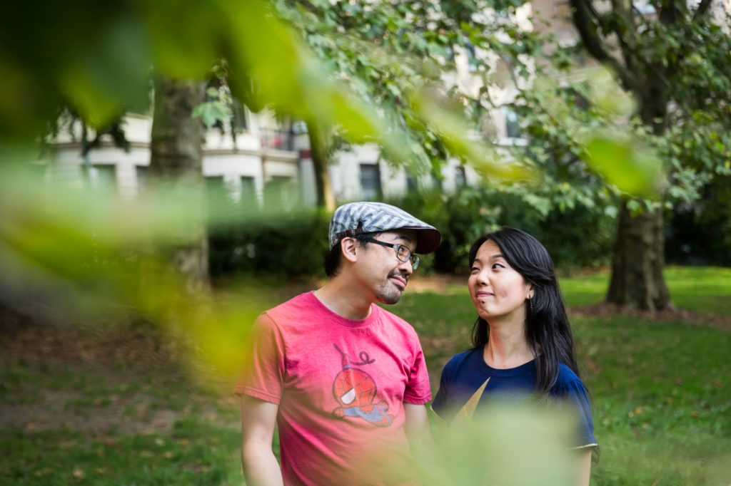I would say Riverside Park is probably the second most popular park for an engagement portrait in the city. The park is scenic: it has waterfront views, a tree-lined promenade and forest-covered areas that make you feel like you have completely left the city. During the summer, there are flower gardens blooming around 79th Street that rival anything in the New York Botanical Garden. Again, if you walk up the park you can easily cross the street to Broadway and include a city feel to your engagement portrait session. If you have a playful nature like my clients Nancy and Jeff, you can also clown around on the park’s dinosaur sculptures in the playground at 96th Street.