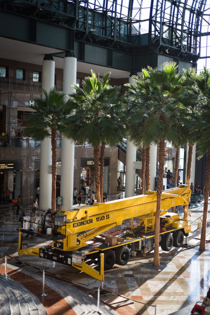 Brookfield Place is a crowded, popular public atrium. Always crawling with people, the space does not have a lot of empty corners in which to take a portrait. There are always events scheduled in the building, and you never know what’s going on here. Case in point, when I visited there was a crane parked in the middle of the atrium. Why? Who knows.