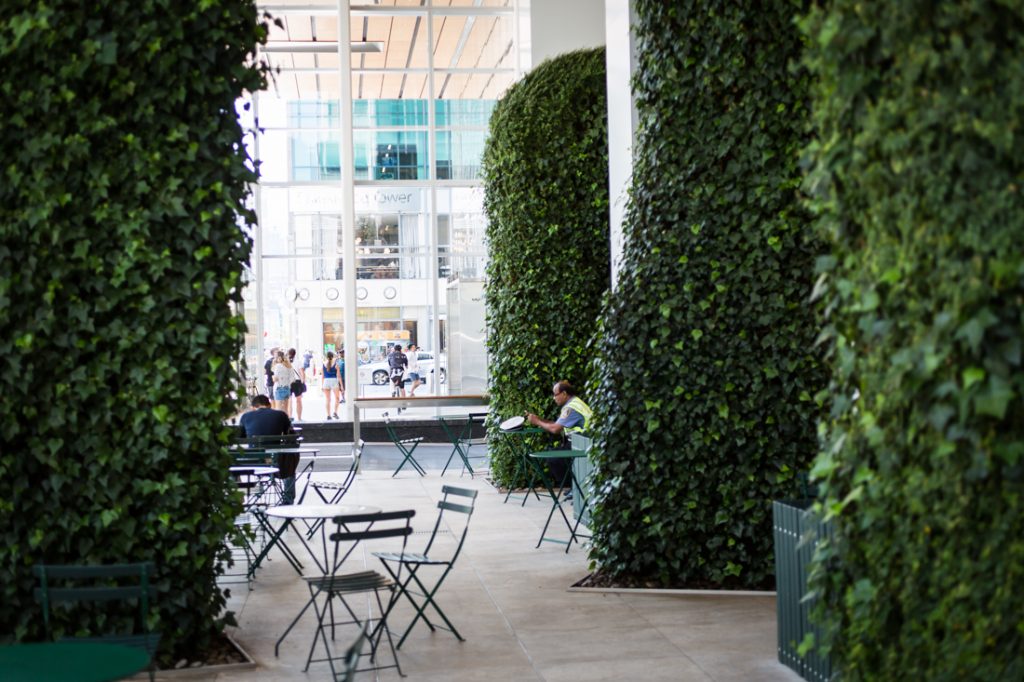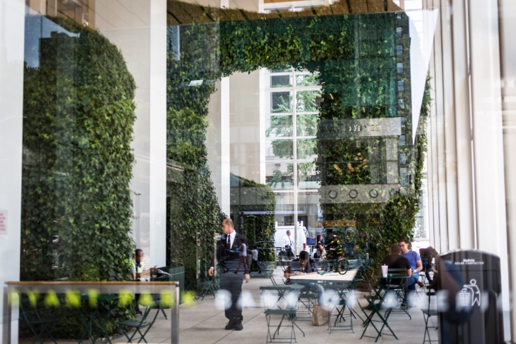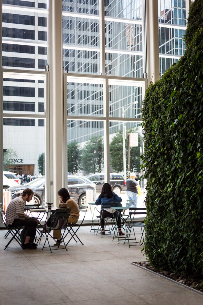 This was the greenest of the public atriums that I visited, but sadly, I was chased away by a very determined security guard. Apparently you are not allowed to take any photos in the space. Even if you did want to risk the wrath of the security guards, know that the space is very small, and chock full of visitors. This atrium is centrally located to Times Square, and it’s pretty much busy all the time. The space is tiny: so much so that I felt uncomfortable speaking above a whisper into my phone. I would feel even more uncomfortable if I were to try and stage a big portrait shoot here.