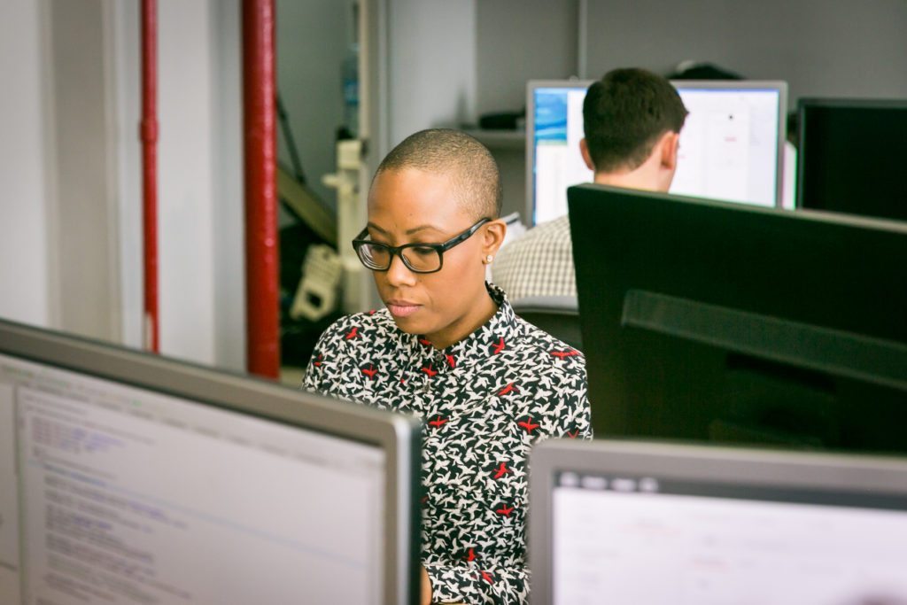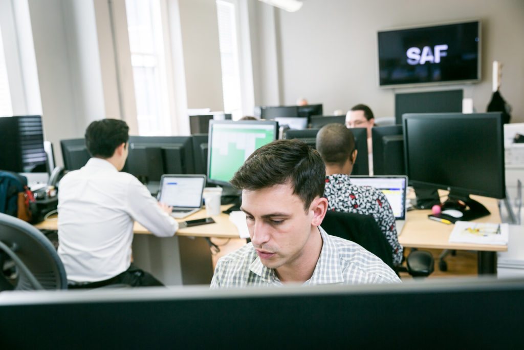 Have activities planned. This company wanted a fly-on-the-wall, photojournalistic-style look to their office interaction shots. As I have been advocating in the past, this is a terrific way to show clients your team at work and to give outsiders a little glimpse behind the curtain of your workplace. Sometimes, however, getting these shots to look completely natural is a bit tricky. We all get nervous in front of the camera, so the best way to prevent turning into a robot as the camera clicks is to have a plan. Brief your employees beforehand that they should have a task ready to do at their desks if need be or a presentation ready if you are going to do this for a conference room shot. Making it all up on the day of the shoot brings out the robot in everyone, but if your team knows what to do then it is much easier to bring out natural movement.