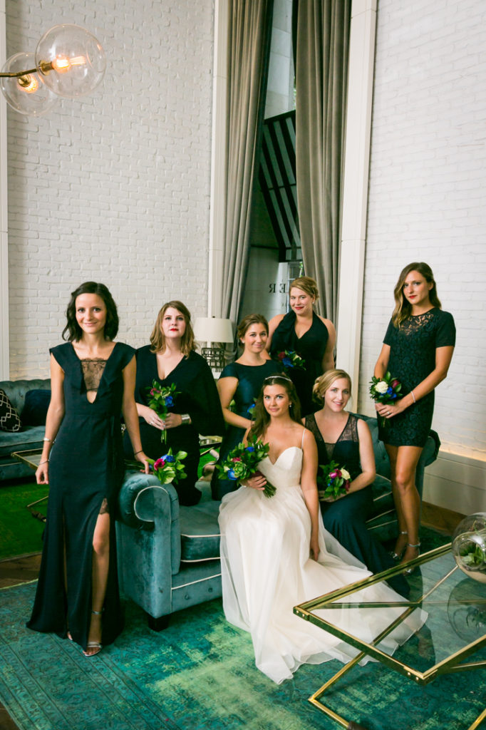 As far as the mixing up each dress style, I have heard advice from stylists to keep the hem lengths all the same. Honestly, I don’t think it matters. If you want the most cohesive look, then keep your hemlines all the same. But if you are ok with a bit of variety, then I recommend keeping at least one thing consistent in each dress – be it the color, neckline or hem. If all the dresses look a bit different from one another, then no one will stand out. What WILL stand out is the one dress that looks radically different – say, the one girl in a miniskirt when everyone else is wearing ball gowns. To prevent this from happening, make sure you coordinate with your girls before anyone purchases her gown.