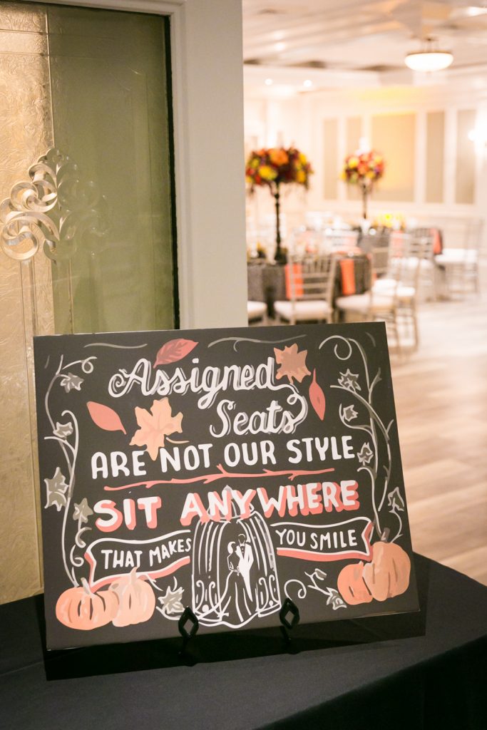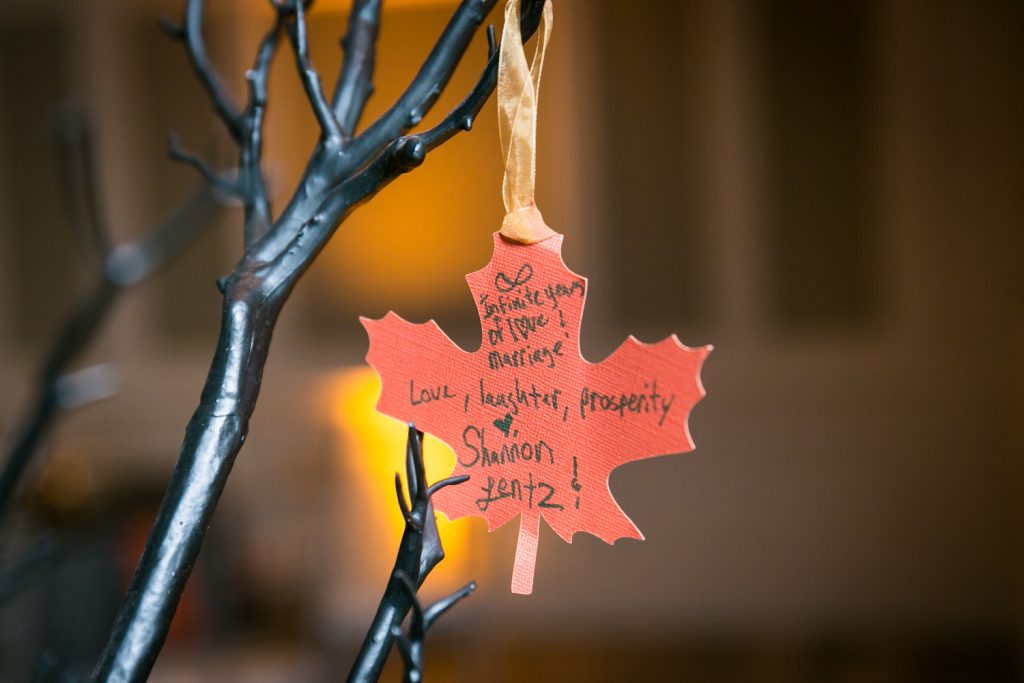 Bear in mind, dear readers, that Alyssa (with Mohan’s input certainly), conceptualized this entire event herself. Personally, I think Alyssa has a second career as an event planner ahead of her. Indeed, I think a lot of what Alyssa went through in planning her day can be applied to any type of event, regardless of theme or season. A few more details you should know about the wedding: the reception was also a birthday celebration for Alyssa’s daughter, and the couple presented a cake to her near the end of the evening. There were special cocktails for the night that included ghoulish candy as garnishes. The guest book was fantastically fall-themed, as guests wrote notes to the couple and tied them on a tree.