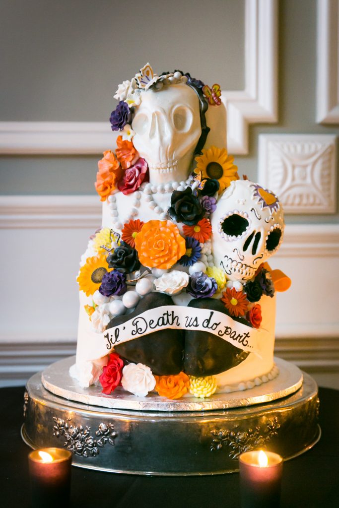 We googled some cake designs and put a few things together. Since our wedding theme was “big party with Halloween inspiration,” it was important that the cake represent who we are and the vibe of the night. No plain layers for us…”Til Death Do Us Part!”