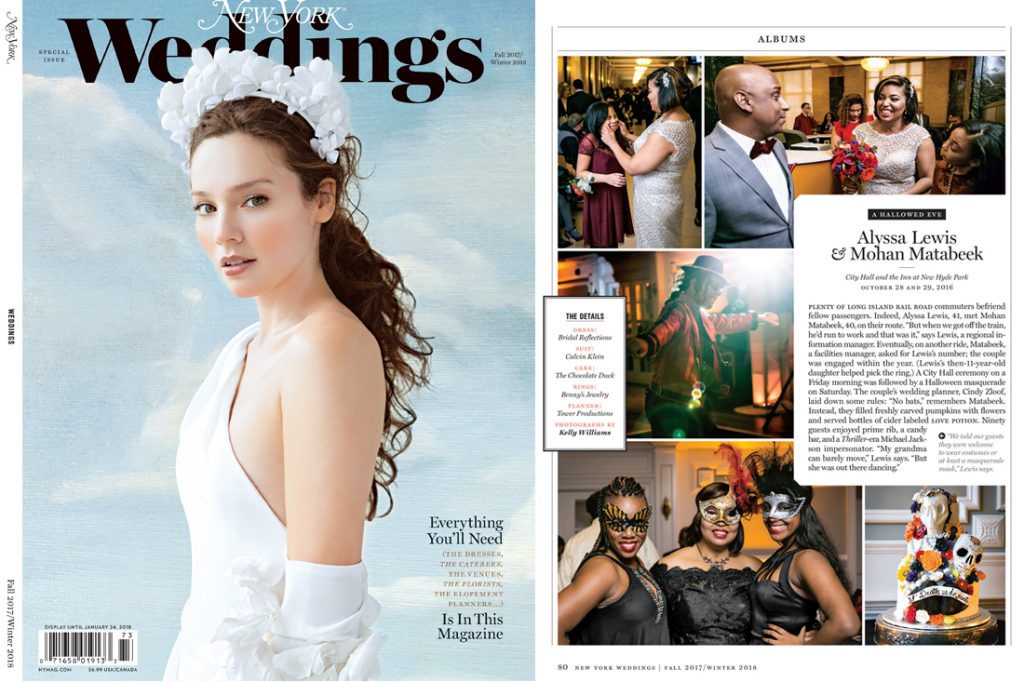 That summer picnic led to love and the Halloween reception which I am sharing with you today. Thanks to being swamped with work at the time of their wedding, I didn’t post a blog about their reception. As the calendar continued, I decided to save their special Halloween treat for this year. My timing worked out perfectly, because Alyssa and Mohan’s wedding was declared so fabulous that it has been featured in the latest issue of New York Magazine Weddings. The issue is on stands now, so pick up your copy.