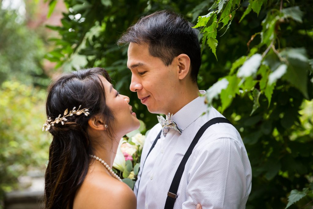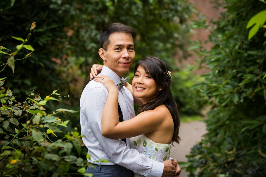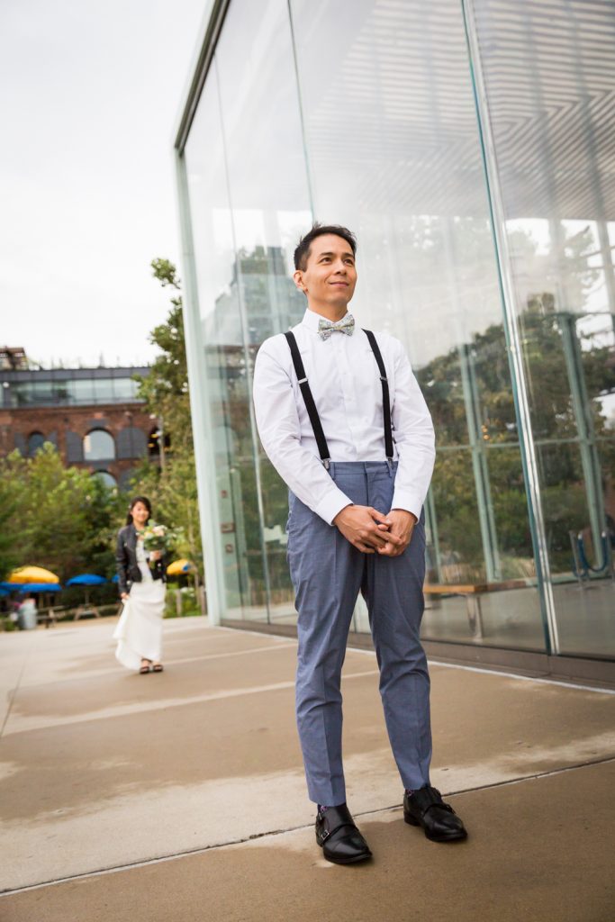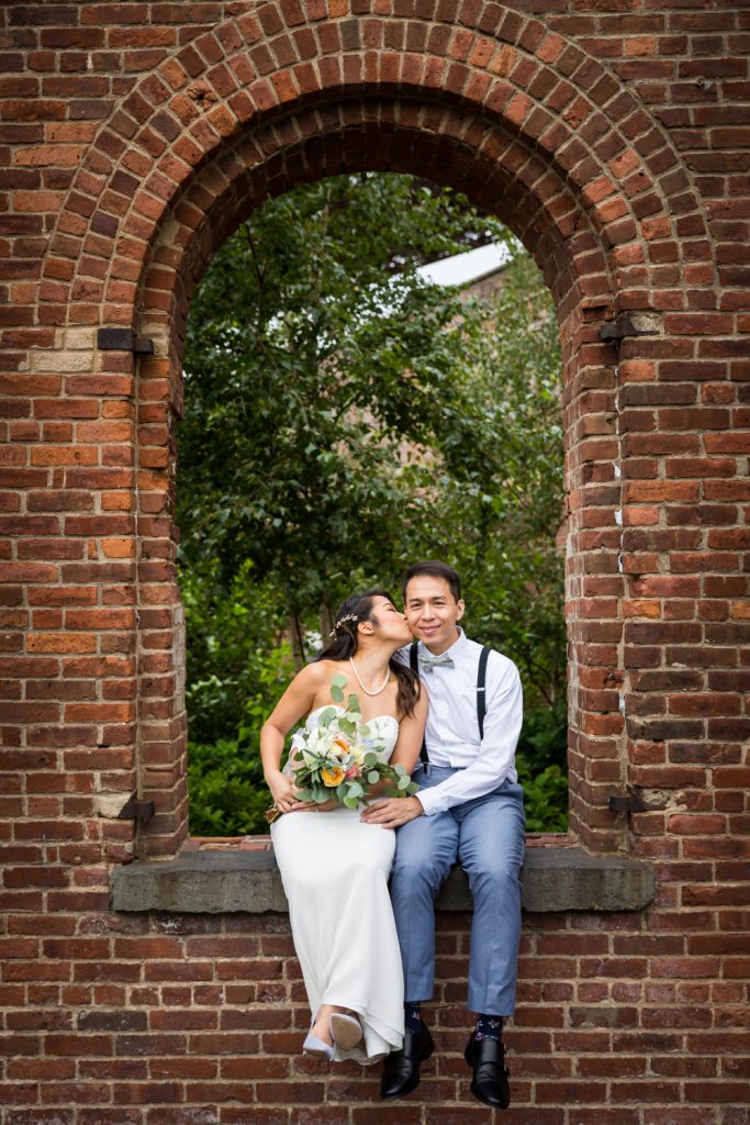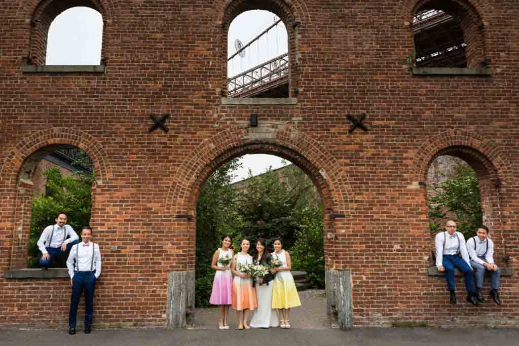 After the first look and photos by the carousel, Cindy, Alan and I walked a short distance to the garden patio outside of St. Ann’s Warehouse Theater. I have been taking photos in New York City for eight years, and St. Ann’s has gone from a derelict ruin to a lush garden that is a joy to use as a photo backdrop. I have photographed proposals, family portraits, and of course, weddings here. It’s a great setting, but of course, it is also very popular. We started taking photos in Brooklyn Bridge Park at 8:00 a.m., and crowds were already starting to form. The early bird gets the good photo, but if we had begun much later in the morning there would have been a line forming to take photos in front of the brick façade. Indeed, because there were so many people around Jane’s Carousel that early in the morning, I elected to take the bridal party photos at St. Ann’s Warehouse and not in front of the carousel.