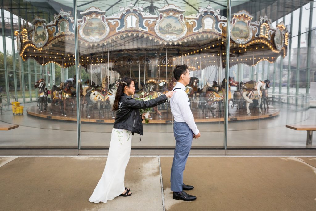 Jane’s Carousel in the middle of Brooklyn Bridge Park holds a special place in Cindy and Alan’s heart: it is the spot where Alan proposed. So, of course, this is the location where we had to set their ‘first look.’ While Alan had not seen Cindy in her dress yet, Cindy’s dress ended up being a complete surprise… and a story that needs to be told. Originally, Cindy commissioned a young designer to create her dream wedding dress. She knew the designer through her church and everything was going according to plan. When she finally saw the dress for the first time, however, the fabric choice was unfortunately too shear. With her wedding day drawing near, Cindy decided to go another route and thankfully a creative option was available. Jeff’s mother (of Nancy and Jeff’s wedding at Bear Mountain) donated to Cindy a dress that was white with lavender flowers on it. It was too sizes too big and had a completely different neckline and straps, but no matter, two weeks later after alterations Cindy had a beautiful wedding dress that fit her to a T.