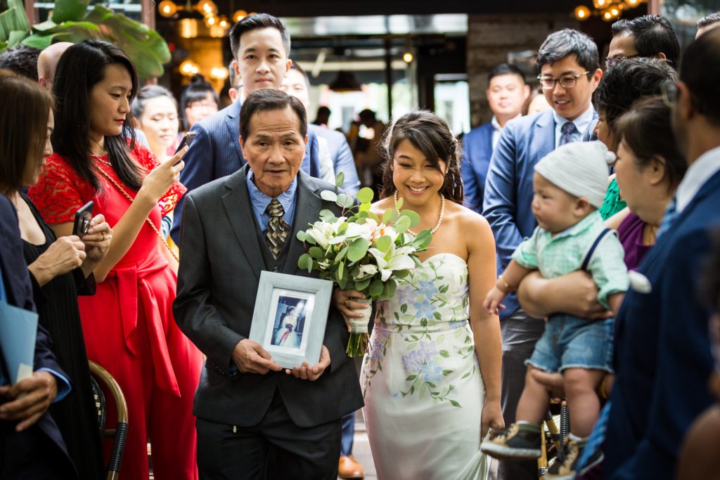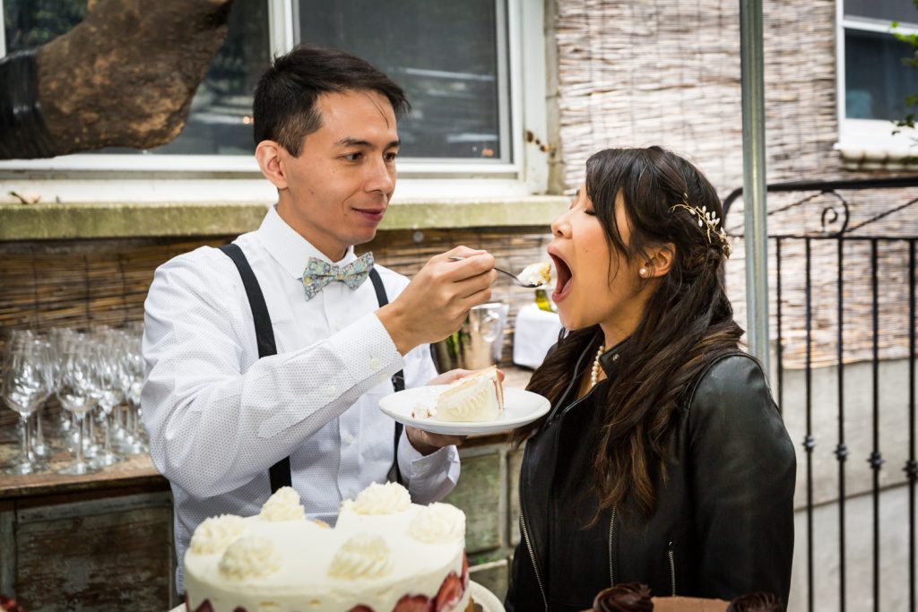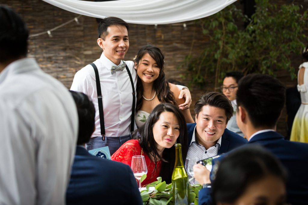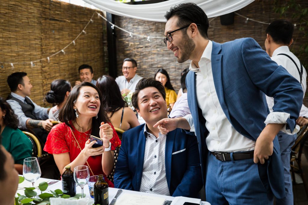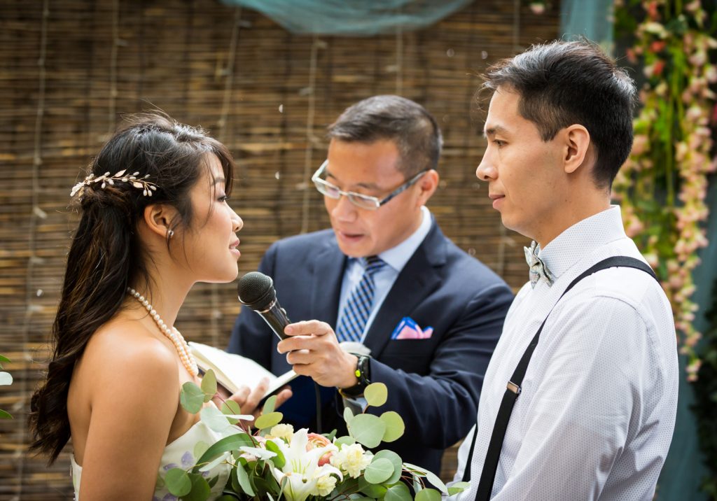 For small weddings, the choice of venues in NYC is virtually limitless. While on the one hand some of the larger venues are off the menu due to a required guest count of at least 100, on the other hand fewer guests mean more opportunities to get creative in your choice of spaces. Beyond the boring wedding hall are a whole host of spaces including art galleries, libraries, and restaurants. Cindy and Alan wanted a space that could accommodate their 85-person ceremony and serve excellent food in a garden environment. Bacchus Bistro and Wine Bar fit the bill perfectly. The space has a large, covered patio, and of course, the restaurant is well known in Brooklyn for its French fare.