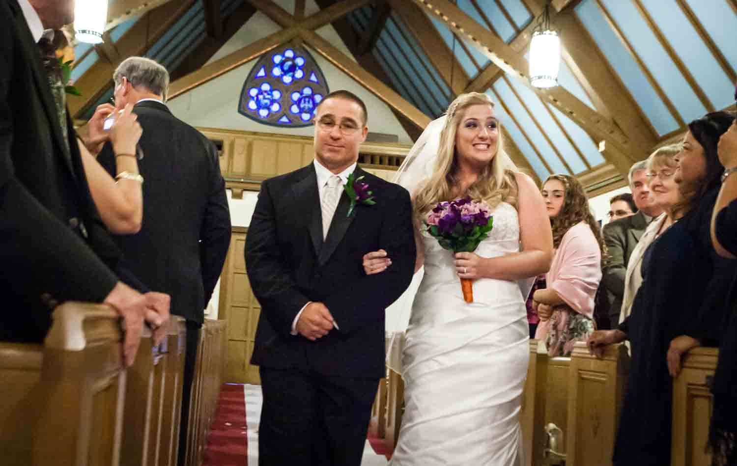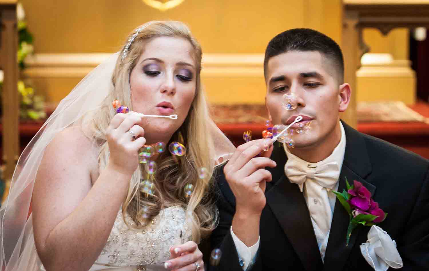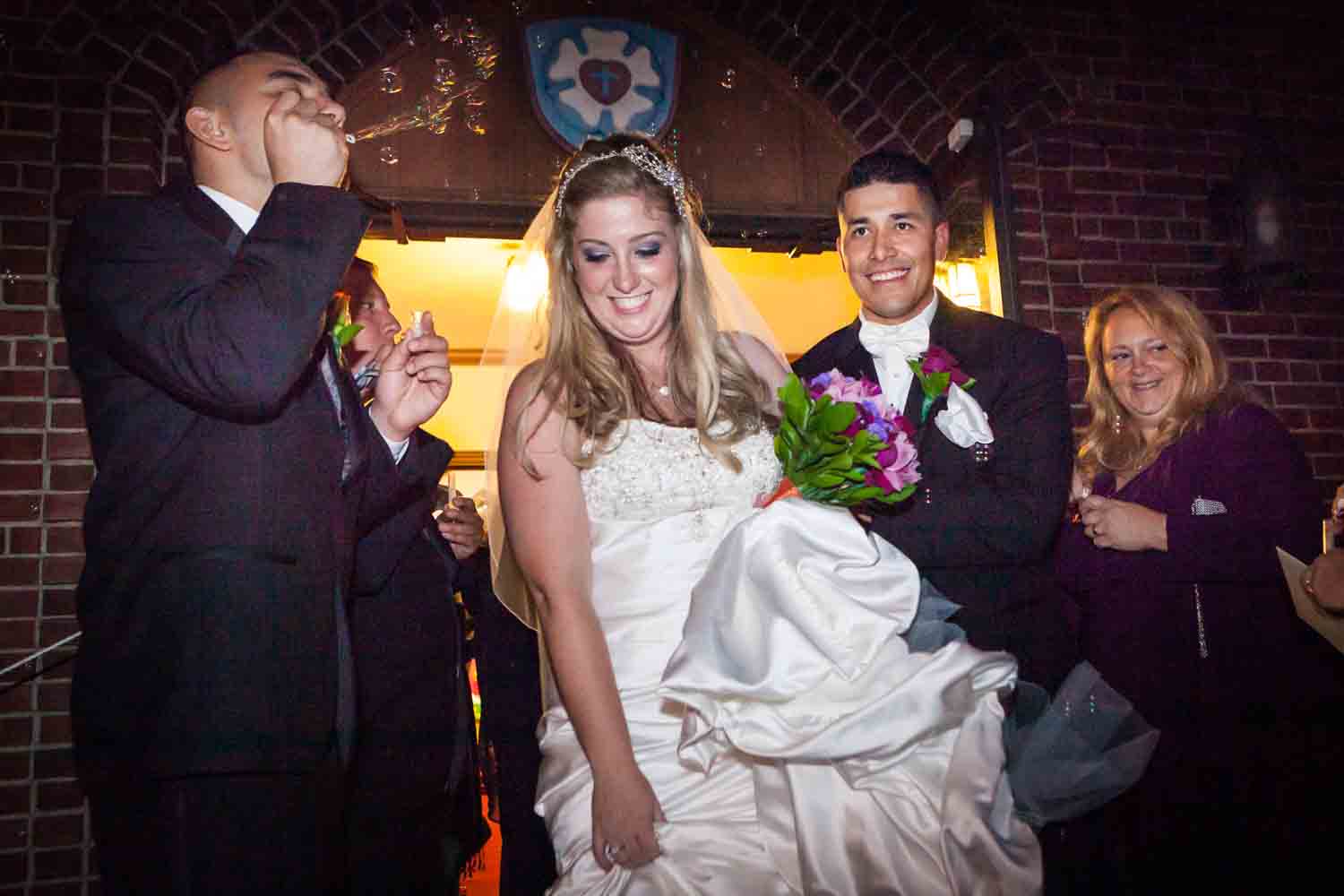 Rebecca and Jose did not see each other until the bride walked down the aisle of their family church. Friends and family watched as Rebecca and Jose exchanged vows. At the end, they were surrounded by bubbles trying to make their way to the limo.