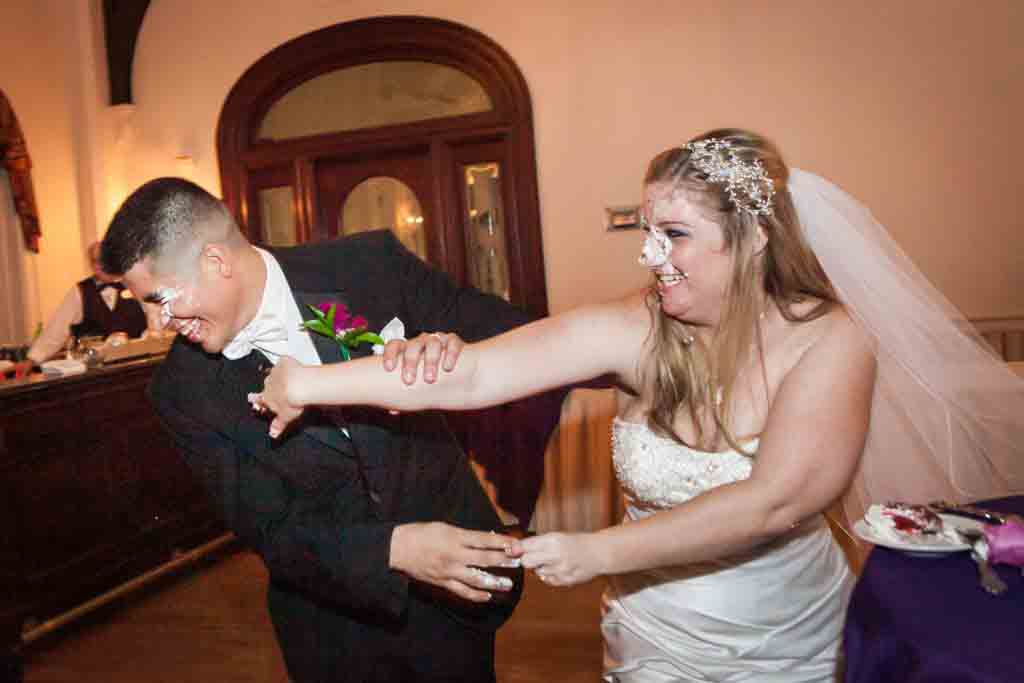 Don’t worry: it was all smiles afterwards. But let’s just say that the groom was a little bit enthusiastic about feeding his wife a slice of cake. I’ll let the photos tell the rest of the story. Kids, don’t try this at home.