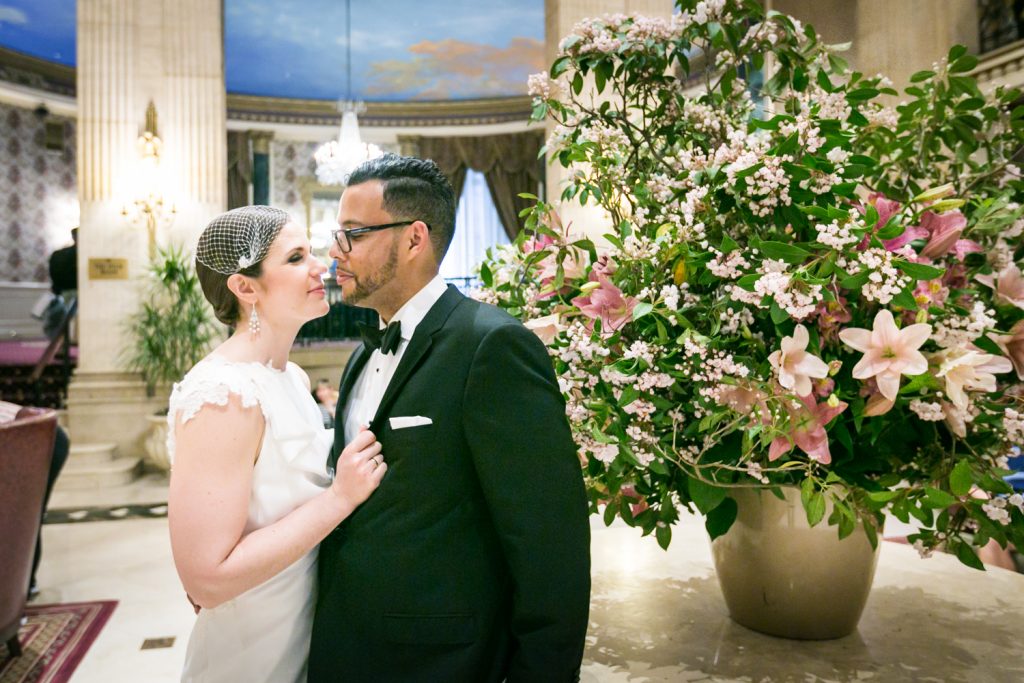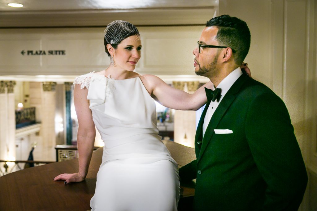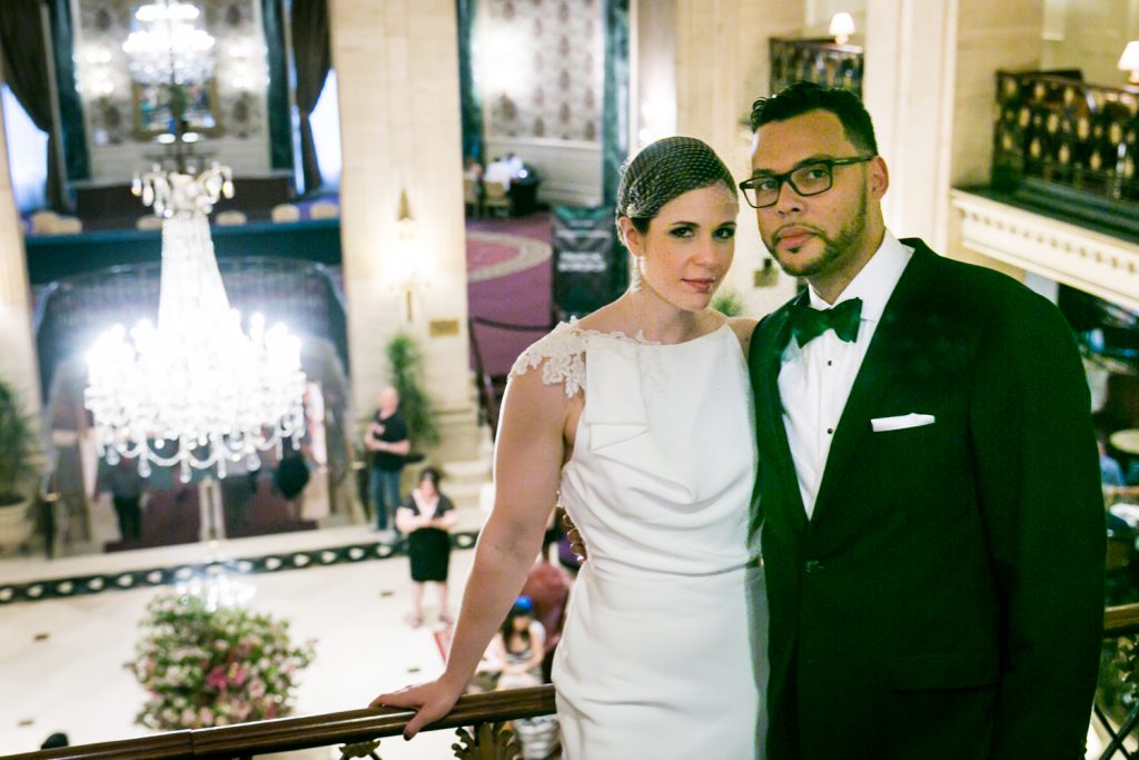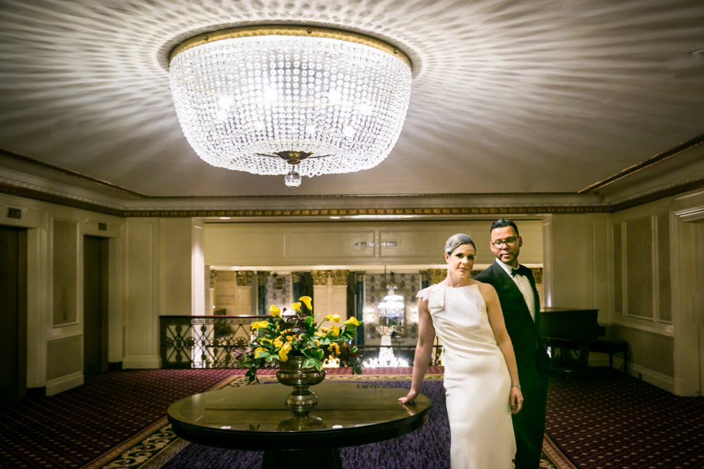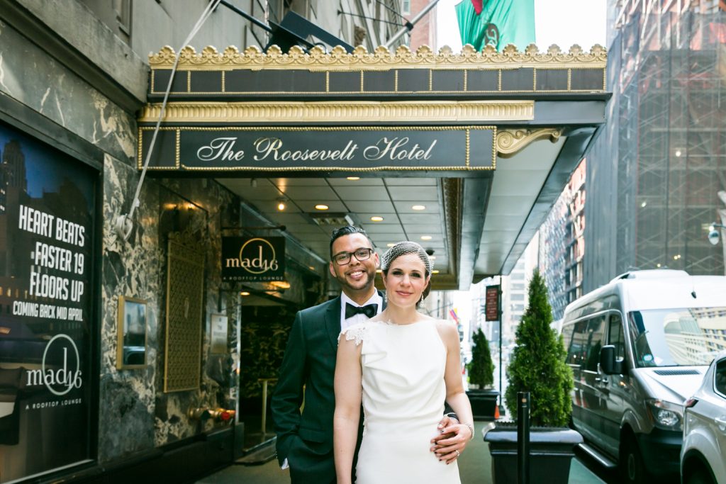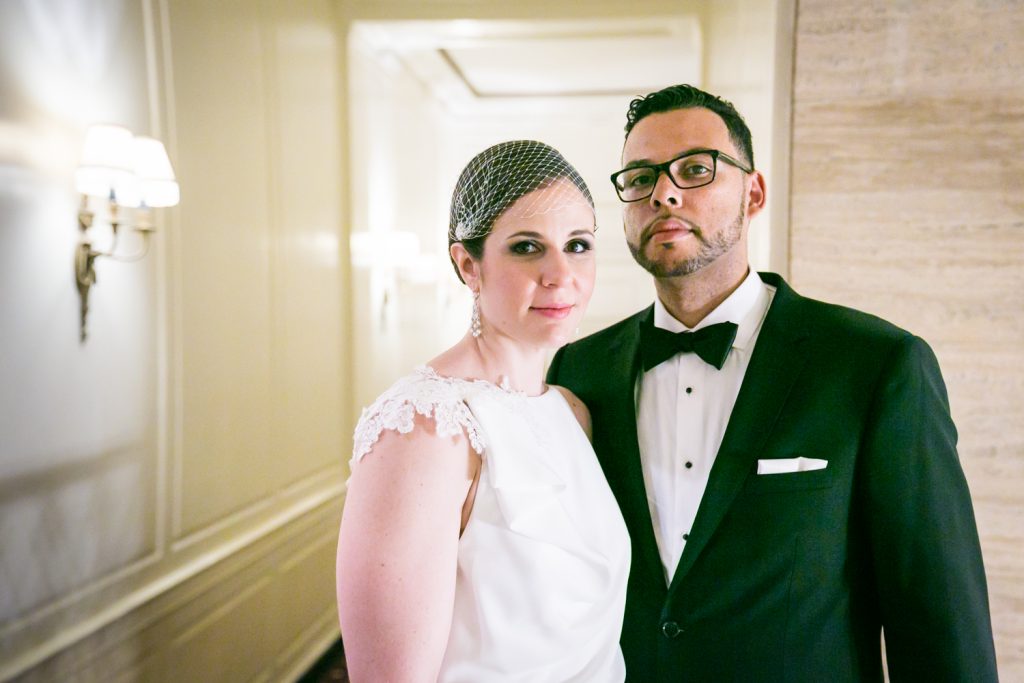 The couple started the day by saying their vows at Jonathan’s childhood church in Astoria. Eventually they would get down on the dance floor with family and friends at the Liberty in Manhattan. But they had one thing to do first — create an elegant set of Roosevelt Hotel wedding photos with me. The resulting images are fantastic…I mean, how could they not be with a couple dressed as well as these two? Check out the photos and get all the details from their wedding in today’s blog post.