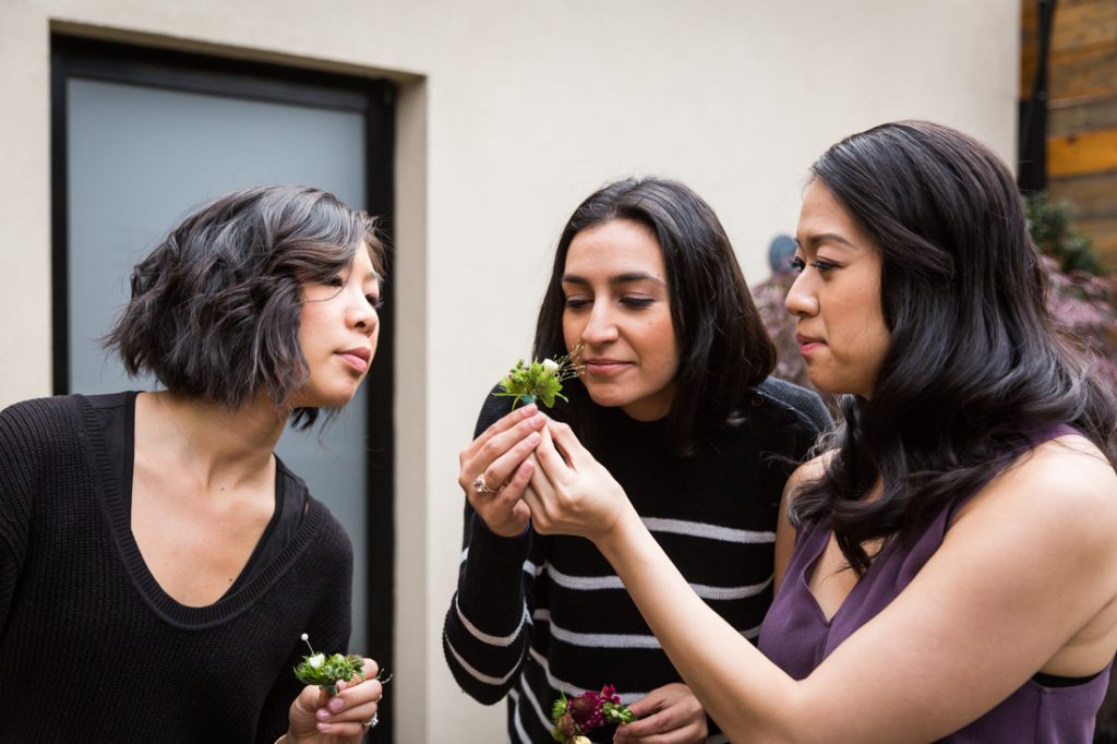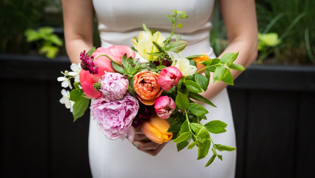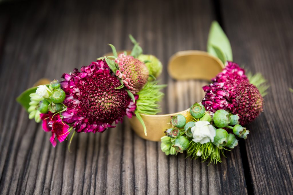 I want to make special mention of the florist, India Faso, who provided the exquisite flowers for Genny and Blaine’s wedding. She is new to the business, but sources a good chunk of her flowers from a farm upstate (Rocksteady Farm). Genny was specifically looking for a locally-sourced florist for both environmental and cost reasons. Along comes India with the best, and most unique, bouquets I have seen since working with Sprout in Brooklyn. From the colorful cloth used to wrap the bouquet, to the brass tacks on the handle, these flowers were on point from top to bottom. Note that India precisely complied with Genny’s request for original flowers that poked out in unusual ways. Check out the corsages India made for the mothers: those are flowers glued to real metallic cuffs. Genius idea, and one I will be stealing for my own jewelry box.