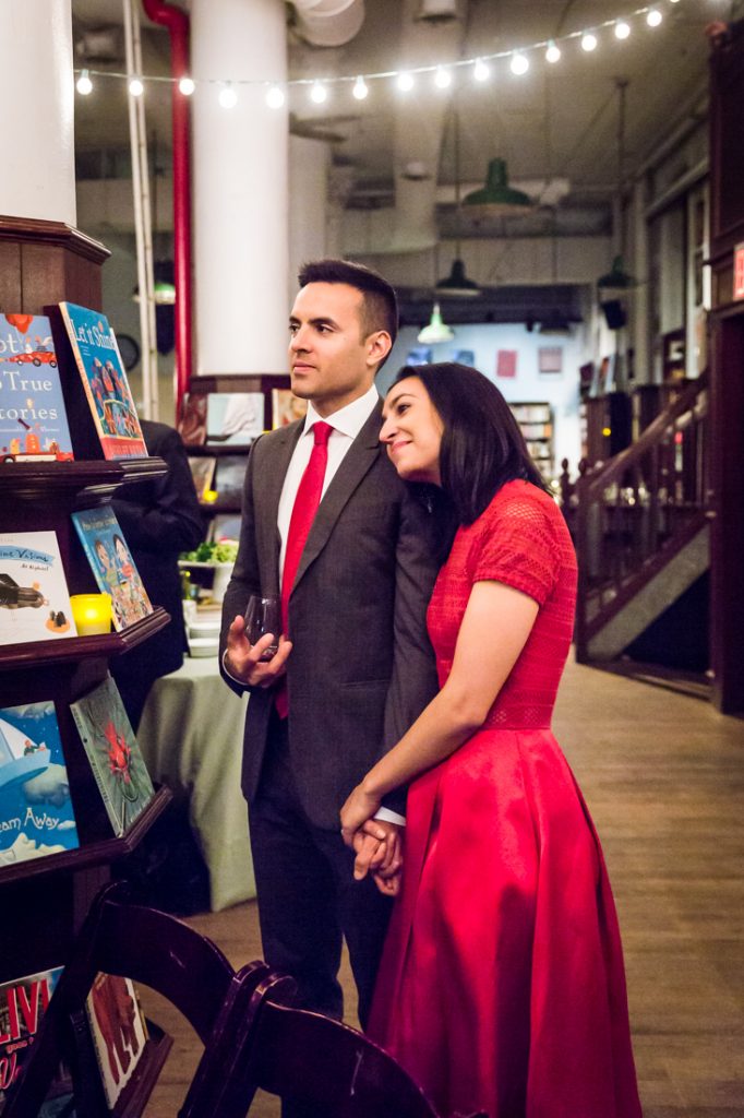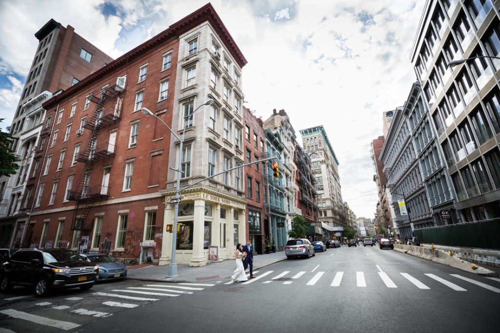 In comparison, while Genny and Blaine enjoy the cobblestone streets and old-school architecture of SoHo, they are quite shy in front of the camera. They were not prepared for the fact that walking with a bride and groom down Crosby Street is akin to waving a red flag in front of a bull. Everyone stopped, stared, and of course offered their congratulations. That’s all well and good, but if you are not a professional model, then having hundreds of eyes on you is an uncomfortable situation. There are little streets and alleyways where you can duck away from the maddening crowd, but you need to be prepared that this area in general is heavily trafficked by tourists. I think most people only associate Times Square, the Empire State building and the like as major tourist areas. If you are getting married here, be prepared that SoHo is also a very popular destination for tourists and fashionistas alike. I recommend the following areas to avoid the crowds: the alley across from Housing Works Bookstore, the park between Chrystie and Forsyth Streets, the small streets around old St. Patrick’s Church, and the back end of Mott and Elizabeth streets. Ultimately for Genny and Blaine, the number of tourists was overwhelming (as it would be for me as well), and they elected to have the rest of their photos taken inside the Housing Works Bookstore. I think this was the right decision because it cut down on the couple’s stress levels, which no one needs right before you say ‘I do.’