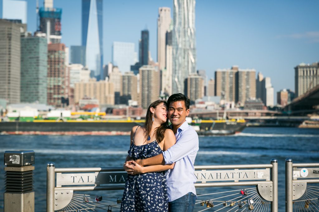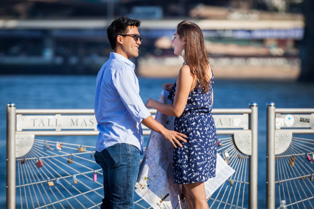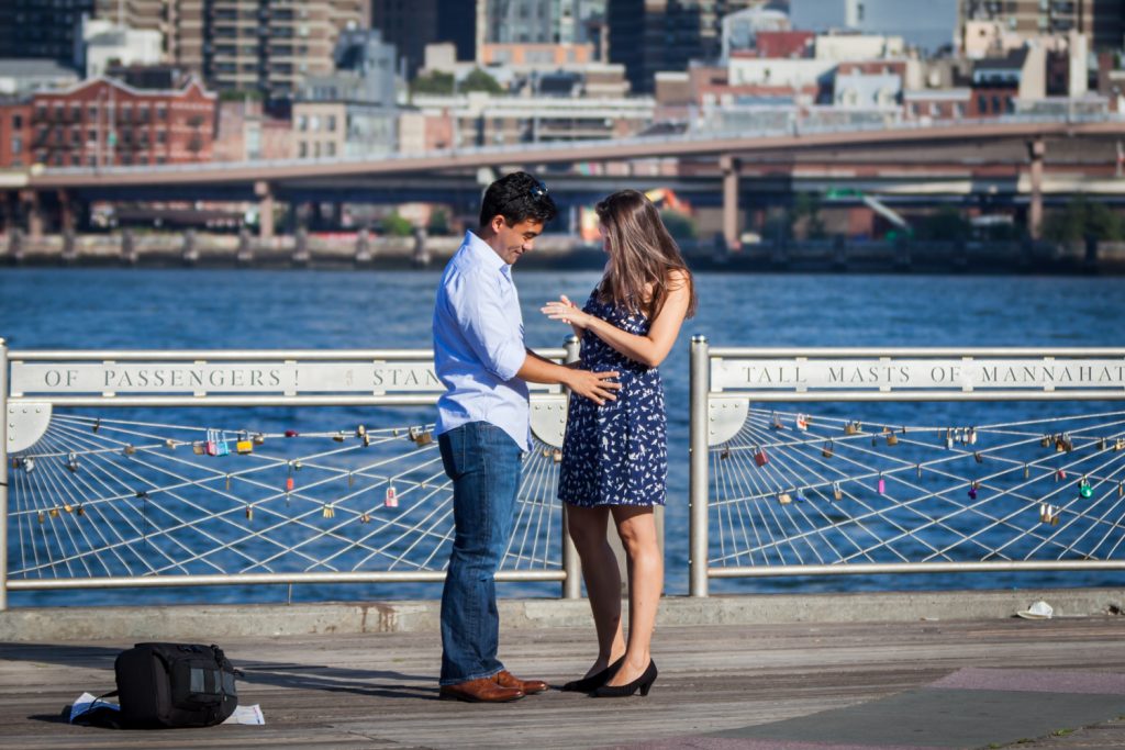 No matter how you ask, the getting it on film part is my job as your photographer. First, let’s talk about location. If you want to surprise your other half and have every moment photographed, then ideally you would pick a location where me carrying a large camera is no big deal. Somewhere tourist-friendly, that walks the fine line between too crowded (Times Square) and too empty. I and my large lens (since I will be photographing you from a distance) need to blend in with the crowd. I’ve been on the top of the Empire State Building and in Central Park with much success. In Mark’s case, he chose Brooklyn Bridge Park because it has a beautiful view of the NYC skyline. He and Elena live in Washington, DC, so this was the perfect spot both in terms of being tourist-friendly and because NYC is a destination that they both love.