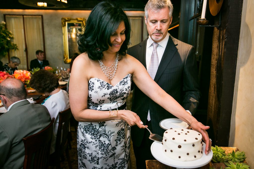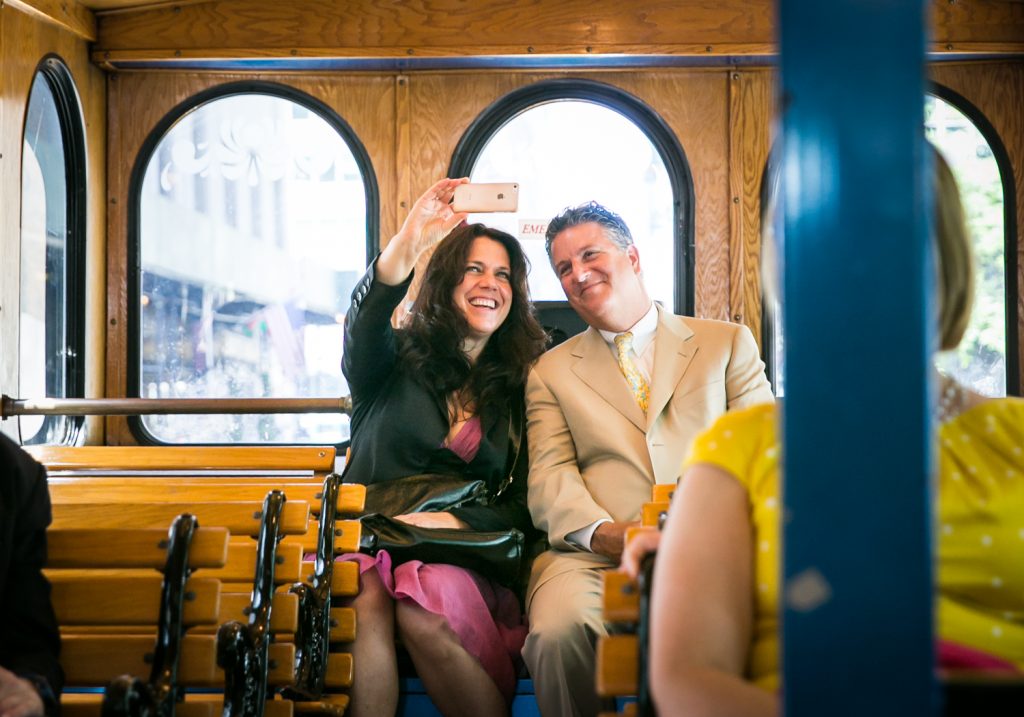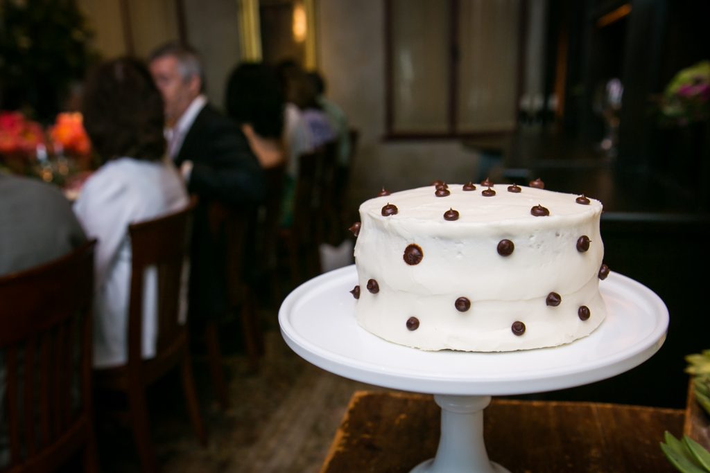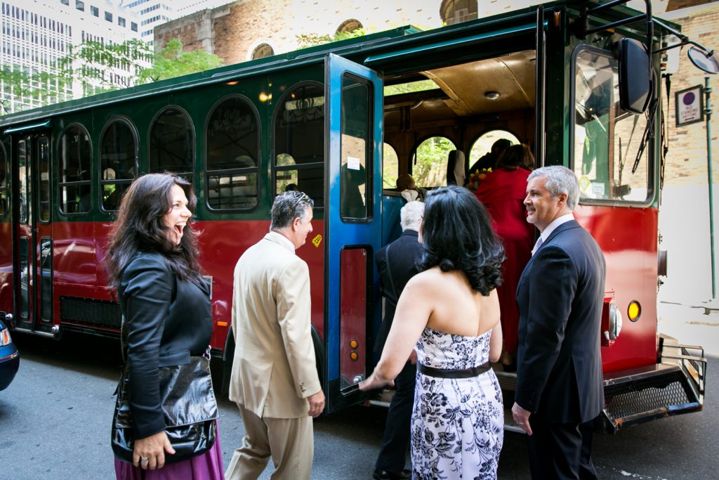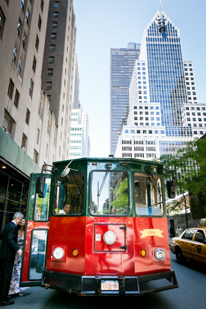 Guests enjoyed a great ride to the Gramercy Tavern reception on a trolley. The food at Gramercy Tavern is always spectacular, and the table was overflowing with lush flowers and vegetation. Speaking of good eats, check out the cookies and cream wedding cake from Amy’s Bread. As noted by Jill, she and Ed purchased the cake from the Amy’s Bread location in Chelsea Market — the original home of the National Biscuit Company factory where the Oreo cook was invented. Enjoy the pics!