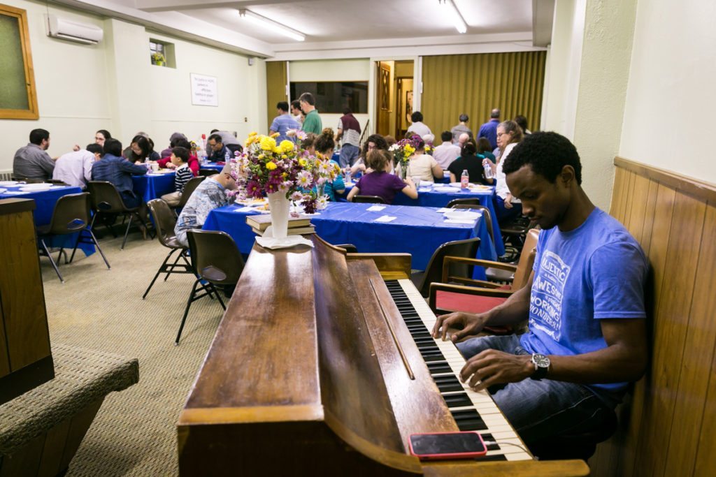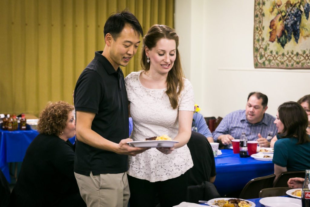 I recently had the pleasure of photographing Sara and Dave, who wisely kept a keen eye on the bottom line for their lovely wedding. Their rehearsal dinner was a family affair held at the Williamsburgh Pentecostal Church, their family place of worship in Brooklyn. For the event, the couple saved a chunk of change by catering the event through Dinosaur Bar-B-Que, and bringing the tasty treats to the church themselves. Other family members brought salads and desserts for a great evening that cost not that much dough. Enjoy the photos!