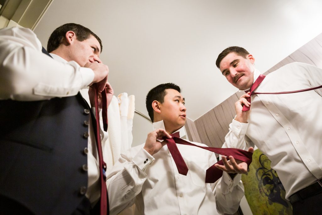 Jane and Matt got ready at the same hotel: the Hilton Garden Inn Westbury. I was pleasantly surprised by this hotel, as it had a friendly, helpful staff and the rooms were quite spacious. Getting ready in the same location made it easy to take photos of the bride AND groom. All I had to do was walk from Jane in the bridal suite down the hall to Matt’s room. And while there were less, shall we say, extensive preparations being done for the guys to get ready, seeing the groom and groomsmen get gussied up always makes for good photos – especially when it comes to ties.