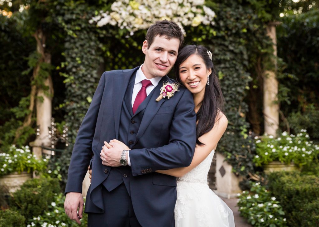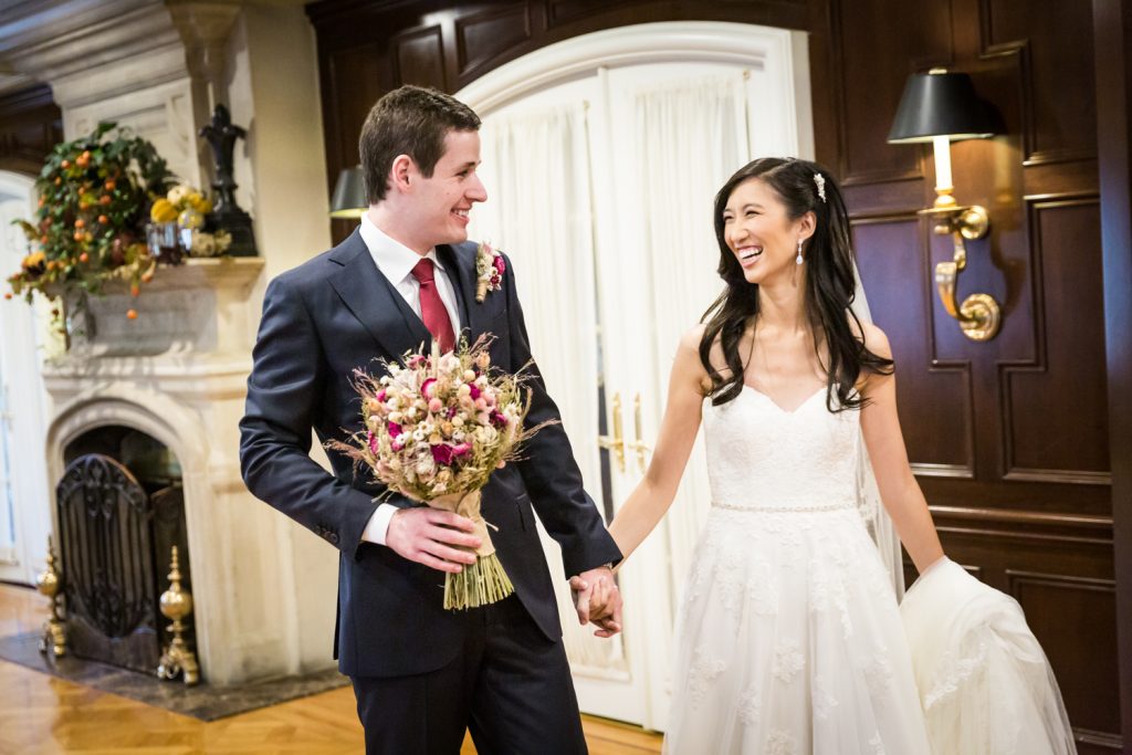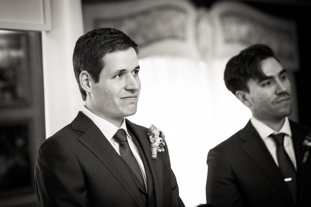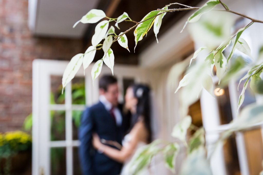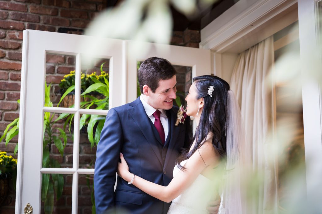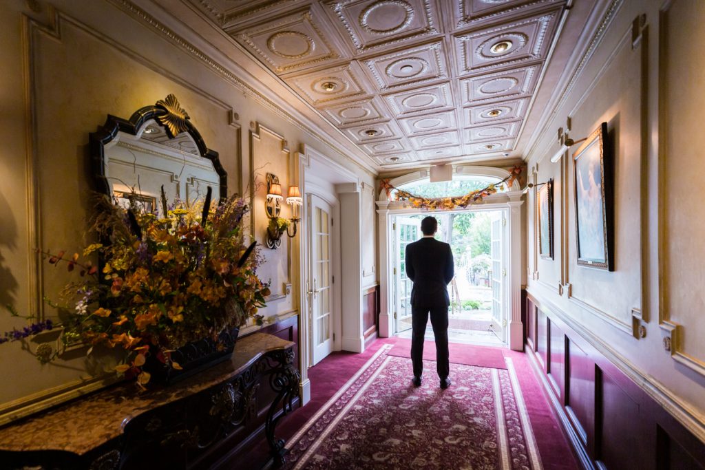 While the evening before had forecast the rain to stop at around 10:00 a.m., it being New York, the weather was predictably unpredictable. It continued to rain through the entire morning, and with the grass being wet, we decided to do all the portraits and the first look indoors. I had originally thought that I would do the first look on the staircase. It’s a quite tight and dark location, but it would have been interesting with the mirrored back wall. Luckily, George – the event coordinator for the day – helpfully suggested that we use the hallway leading out to the garden. With the doors open, there was a glorious amount of natural light, even though it was raining outside. The first look turned out great, and I have to say it was all thanks to George.
