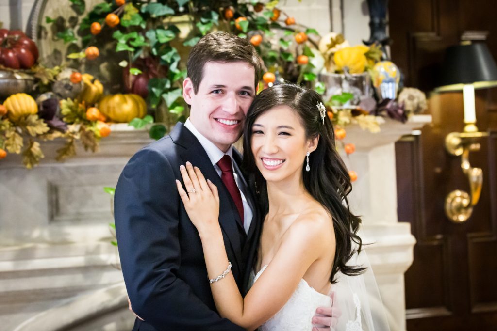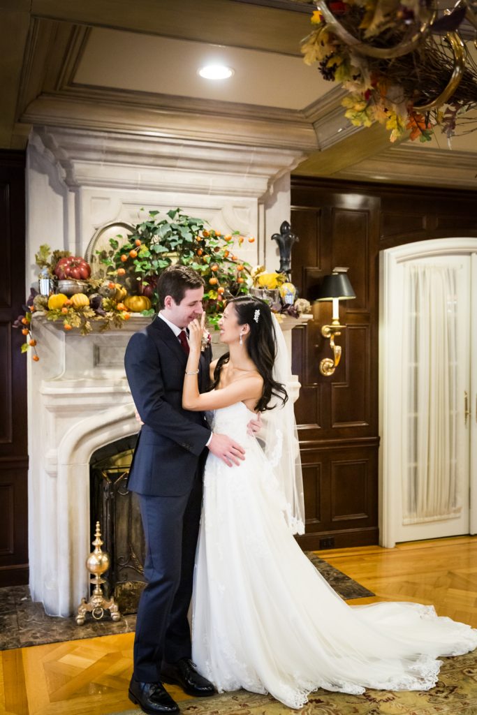 Westbury Manor has a fascinating history. It was built in the 1880s as a private estate, and passed through a few different hands until it was converted into a restaurant in 1946. There are architecturally interesting nooks and crannies everywhere in the venue, and the building has a lot to offer both guests and photographers. Hence, I was not worried at all when I realized we would be doing all of our photos indoors. The venue has a nice fireplace in the library area, and a covered patio that lets in plenty of natural light. These two areas were the main sets for the bride and groom photos. In addition, Westbury Manor has a grand bar adjacent to the library and a funky set of photo booths that I could not resist using for the bridal party portraits.