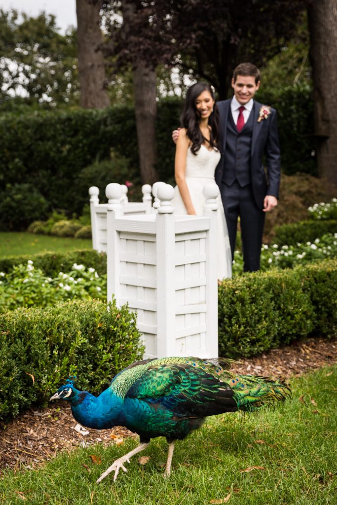 Before the cocktail hour ended, the sun magically made an appearance, and I scampered outside with the couple to take a few photos in the venue’s beautiful gardens. When we opened the patio doors we were greeted by none other than Mr. Peacock. This was a great sign of the stunning photos to come, since the peacock roams the grounds but can’t always be counted on to smile for the camera.