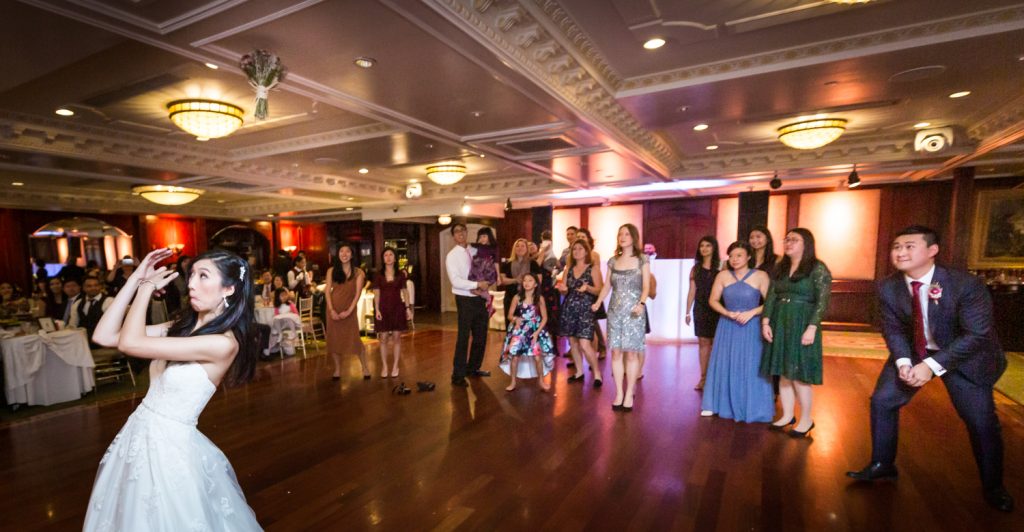 The DJ for the evening was great, but he could not understand why I wanted the bride to do a fake toss first before throwing her bouquet to the crowd. Here’s why: if Jane had just staged a shot of her throwing the bouquet, I wouldn’t have gotten the reaction of the crowd behind her reaching for the bouquet. As I detailed in my article on bouquet toss alternatives, it’s great from a photographer’s standpoint to get two chances to photograph the bouquet toss. On the first (fake) toss, I focus on the bride. On the second (real) toss, I focus on the action. It’s tough to get everything in focus if I have to pan the camera from bride to crowd. With a fake toss, I get the best of both worlds, and you get fantastic, real photos. And besides, it’s always fun to see your friends and family fighting each other over a bouquet — so why not do it twice?