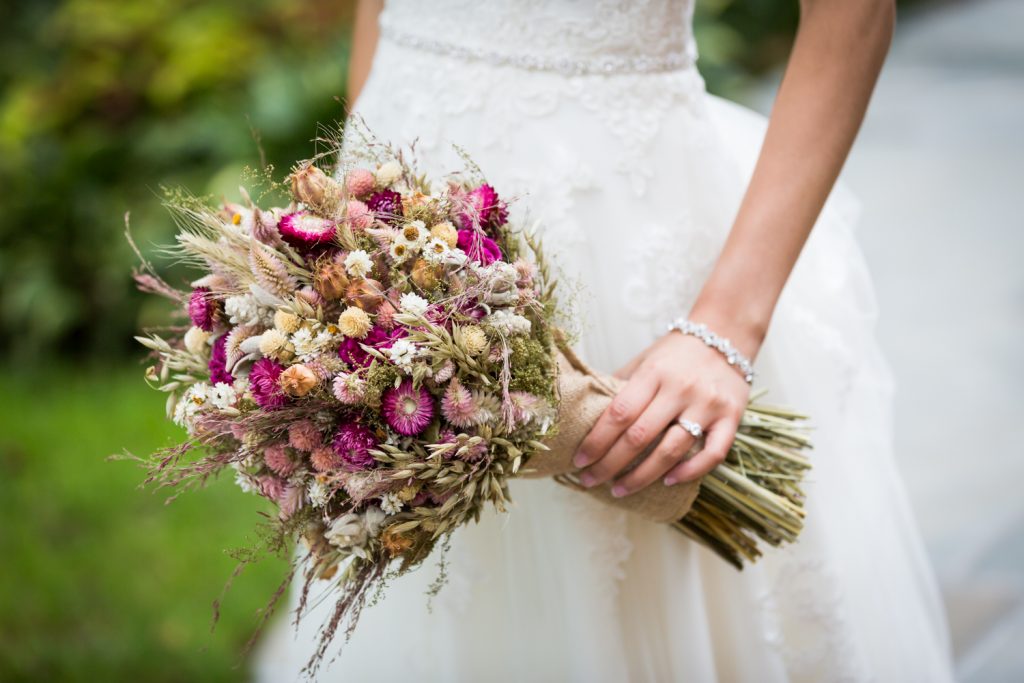 A few final notes about the wedding bling: Jane, like many other brides I have had this year, eschewed the expense of fresh flowers for alternative foliage. She found a florist specializing in dried, but vibrantly colored, flowers at the Union Square farmers market. The dried flowers were used throughout the wedding – from the bouquets and boutonnieres to the centerpieces and cake decorations. Granted, Jane and Matt had to go all the way to the florist’s farm near Albany to pick up the flowers, but it was worth the trip.
